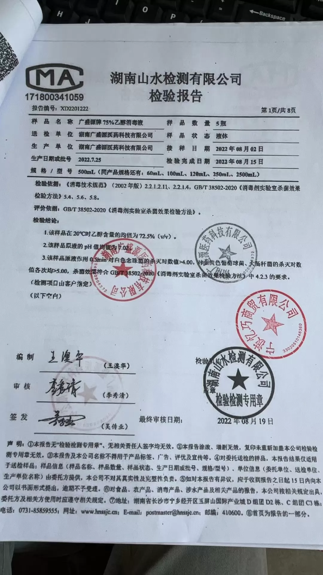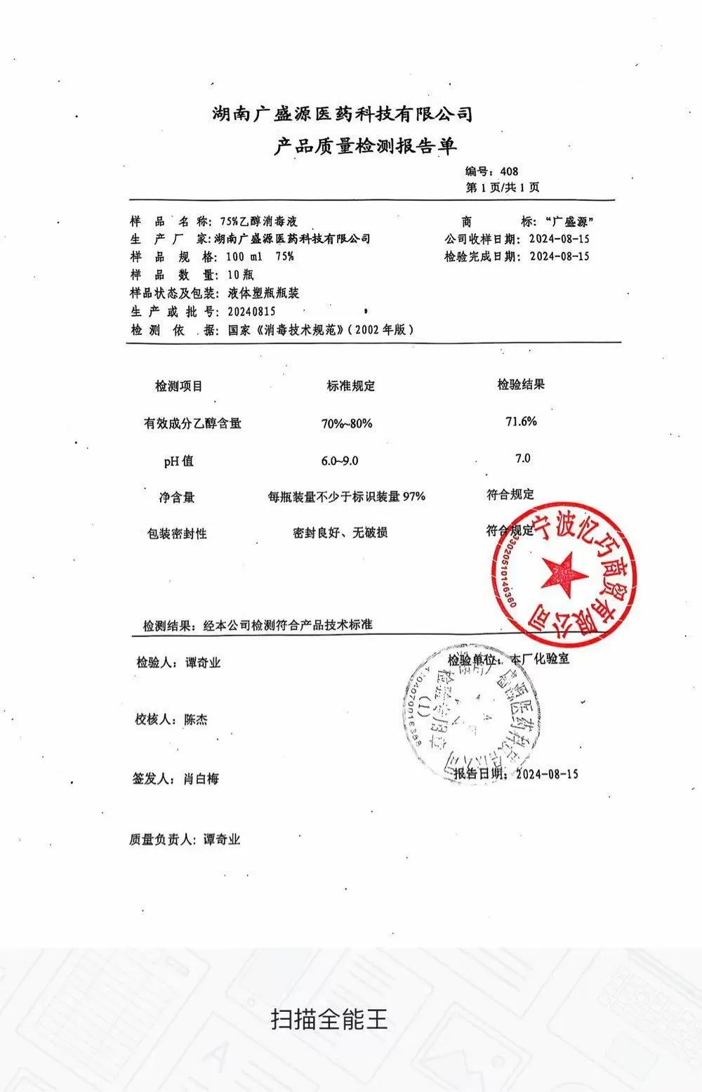 广盛源牌75%医用酒精消毒液100ml 质检单