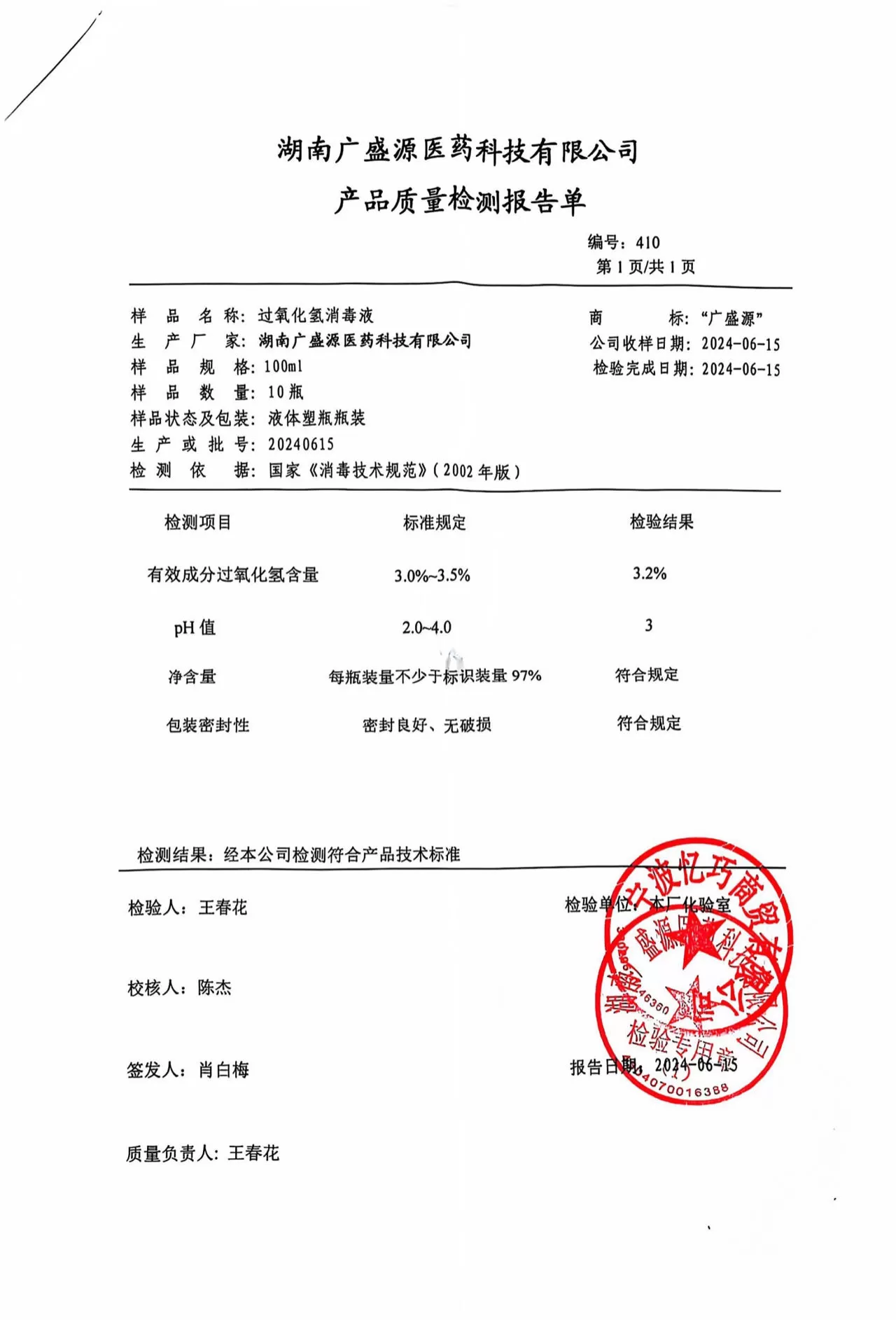 广盛源牌过氧化氢消毒液100ml 质检单