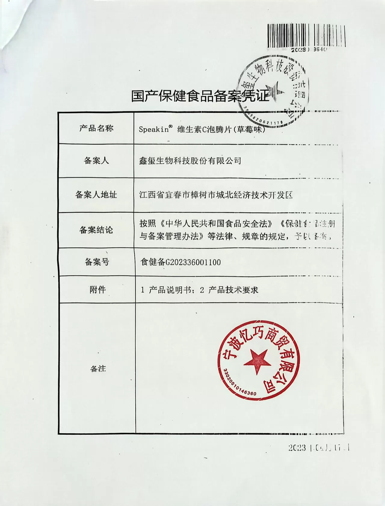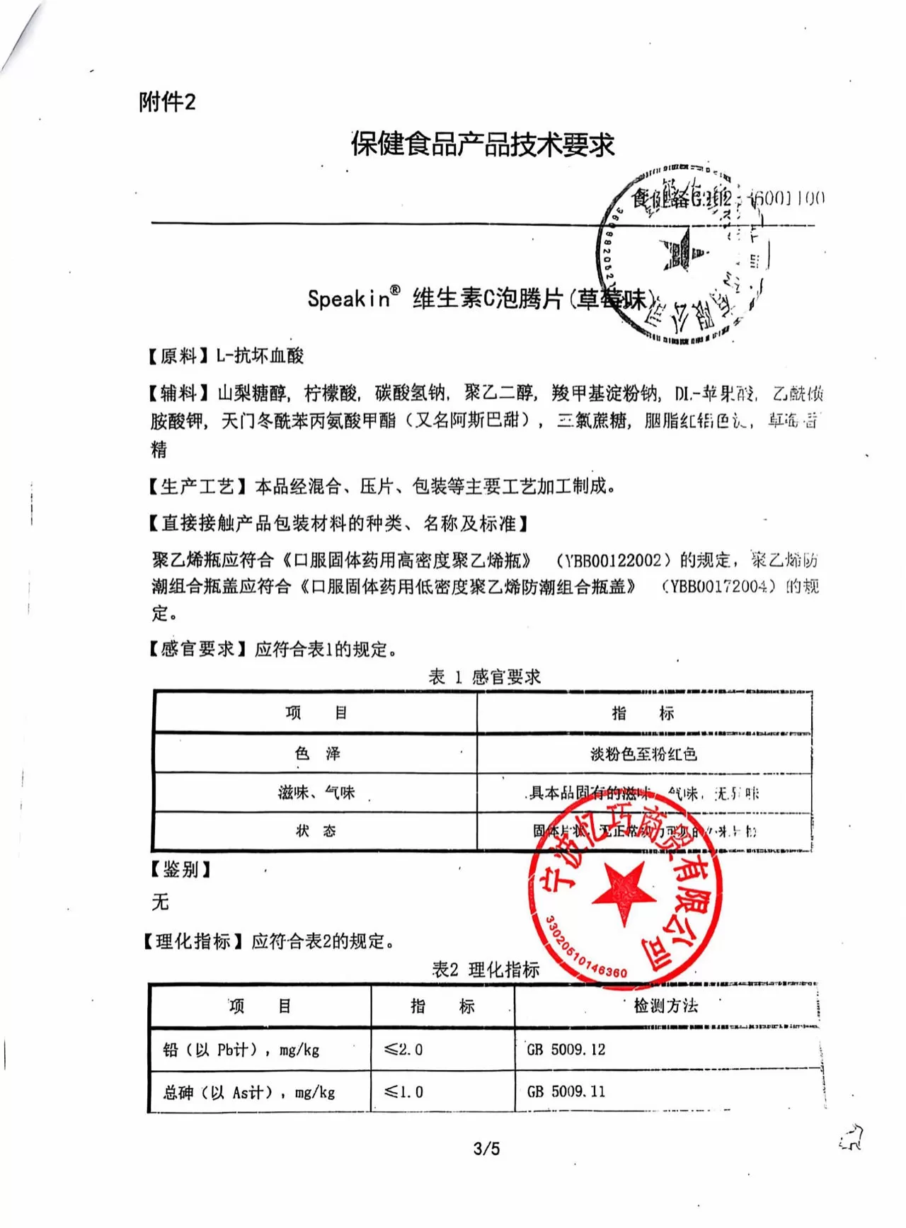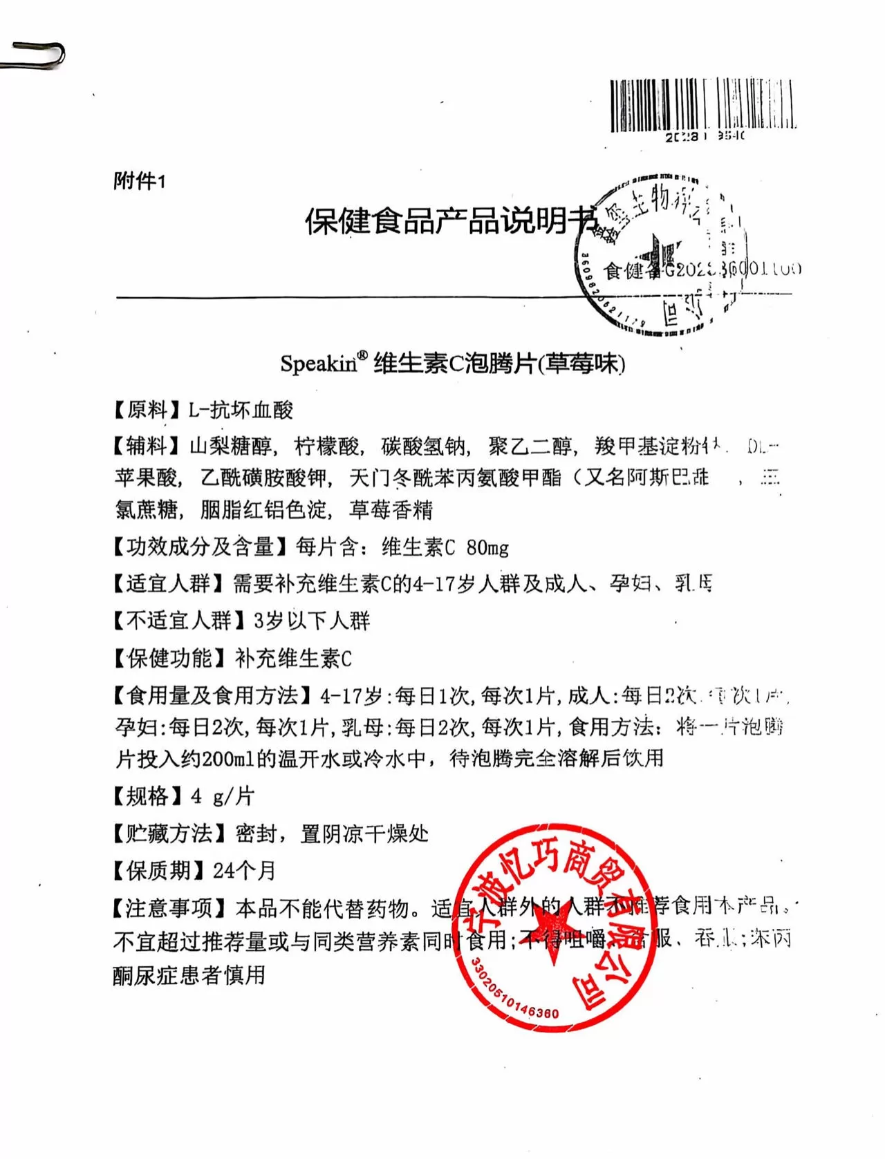 鑫玺Speakin®维生素C泡腾片(草莓味)4g/片*20片【5送1】 产品资料