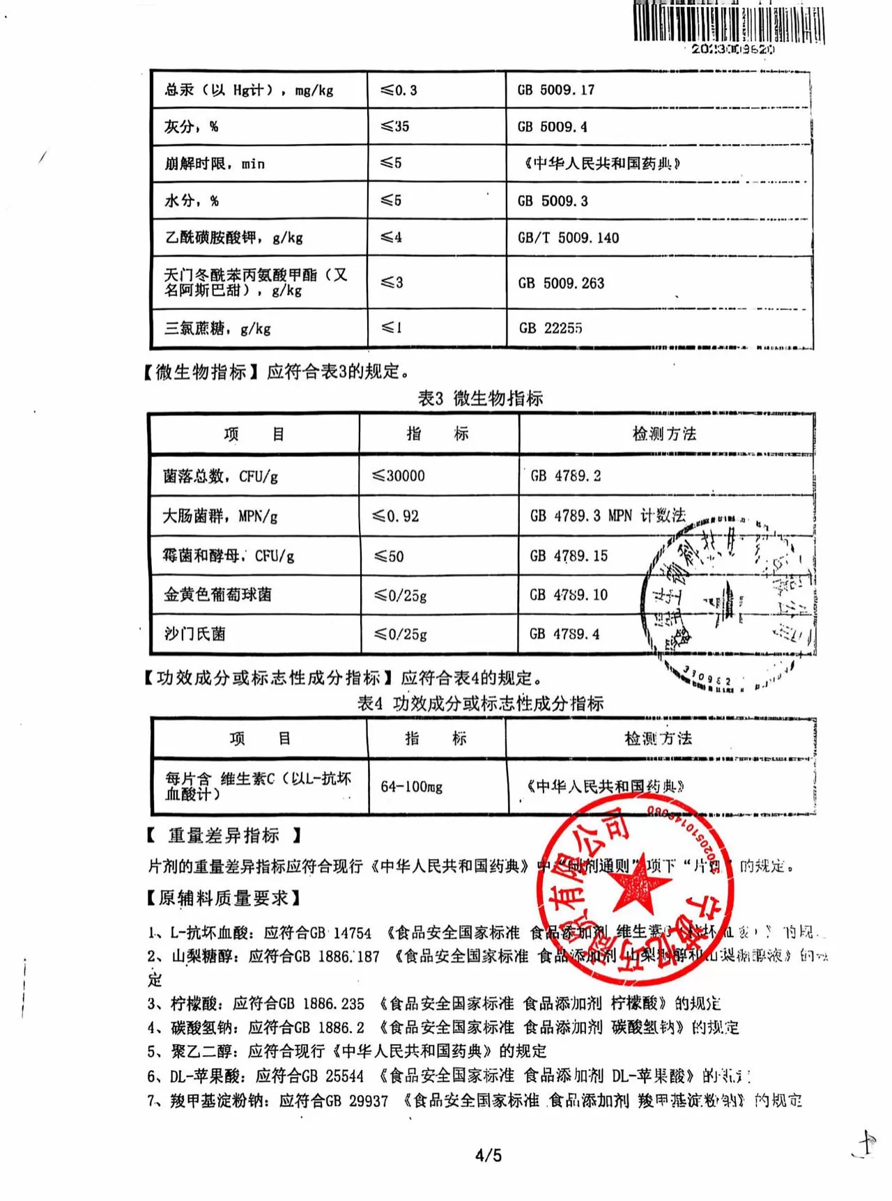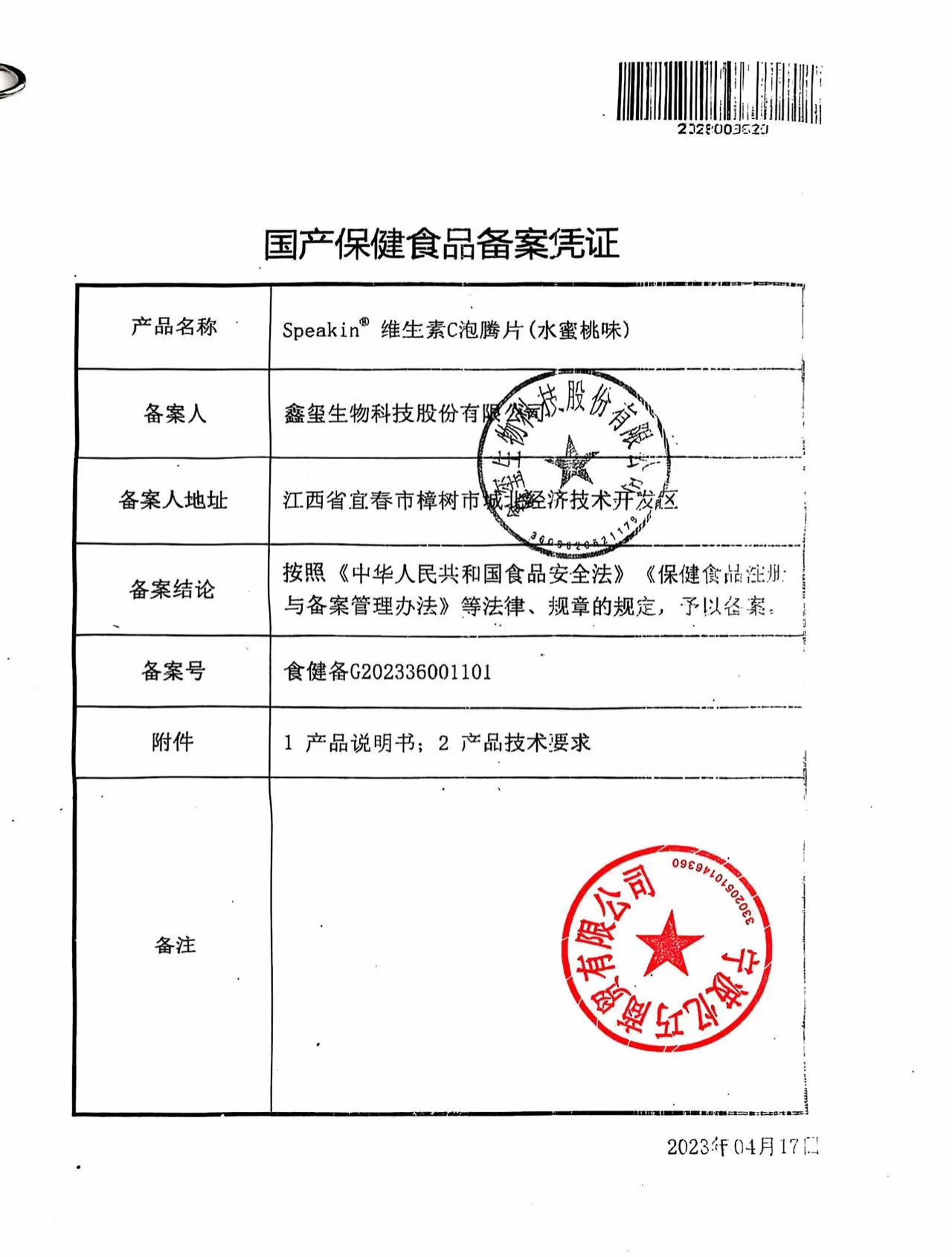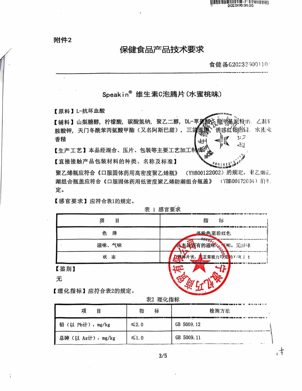 鑫玺Speakin®维生素C泡腾片(水蜜桃味)4g/片*20片【5送1】 产品资料