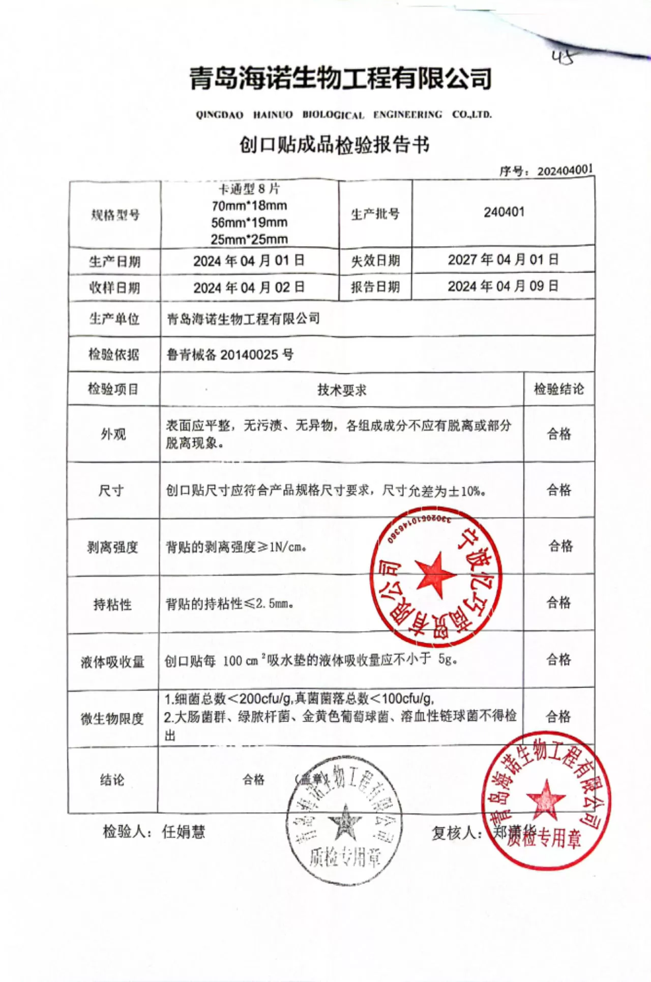 海氏海诺创口贴(卡通型)8片装 质检单