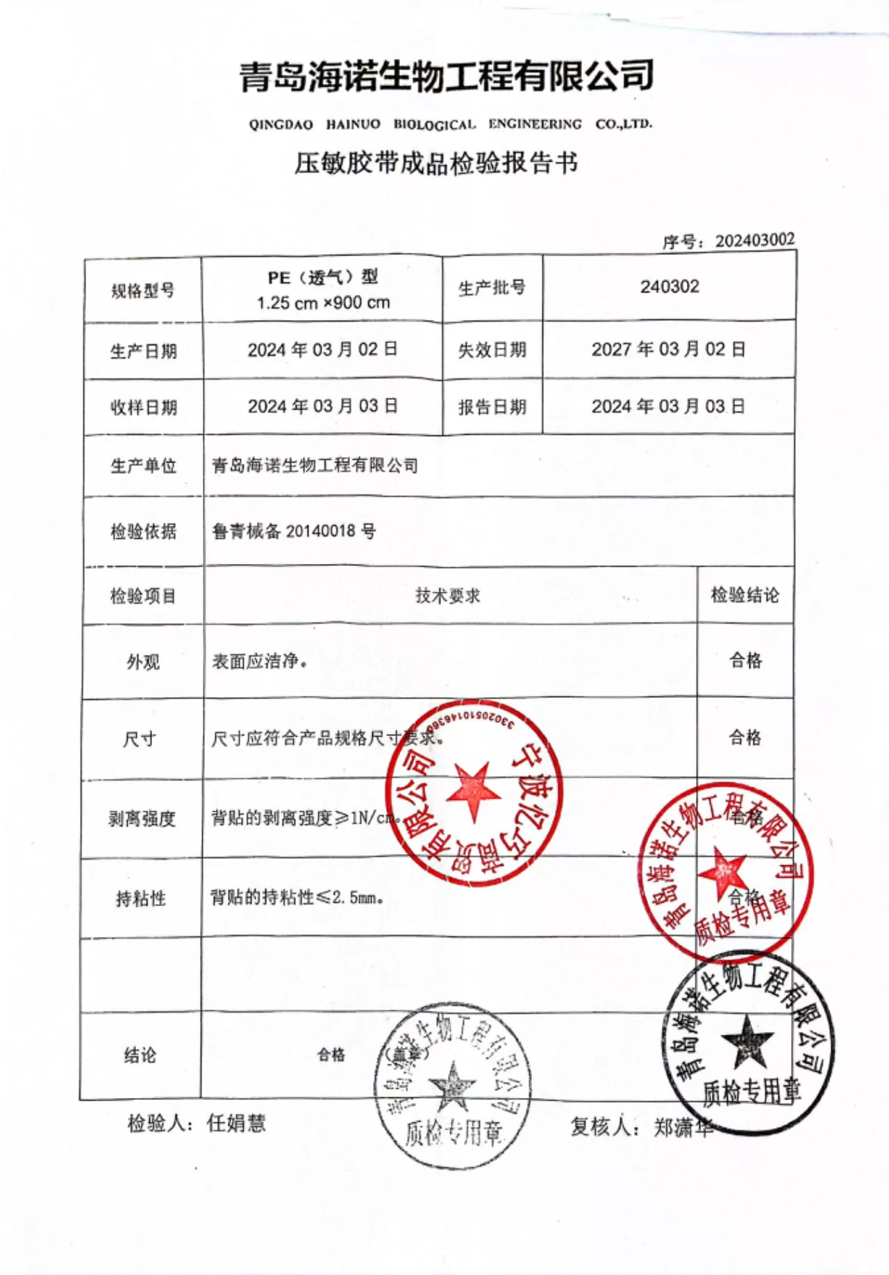 海氏海诺创口贴(经济无纺布型)100片 质检单