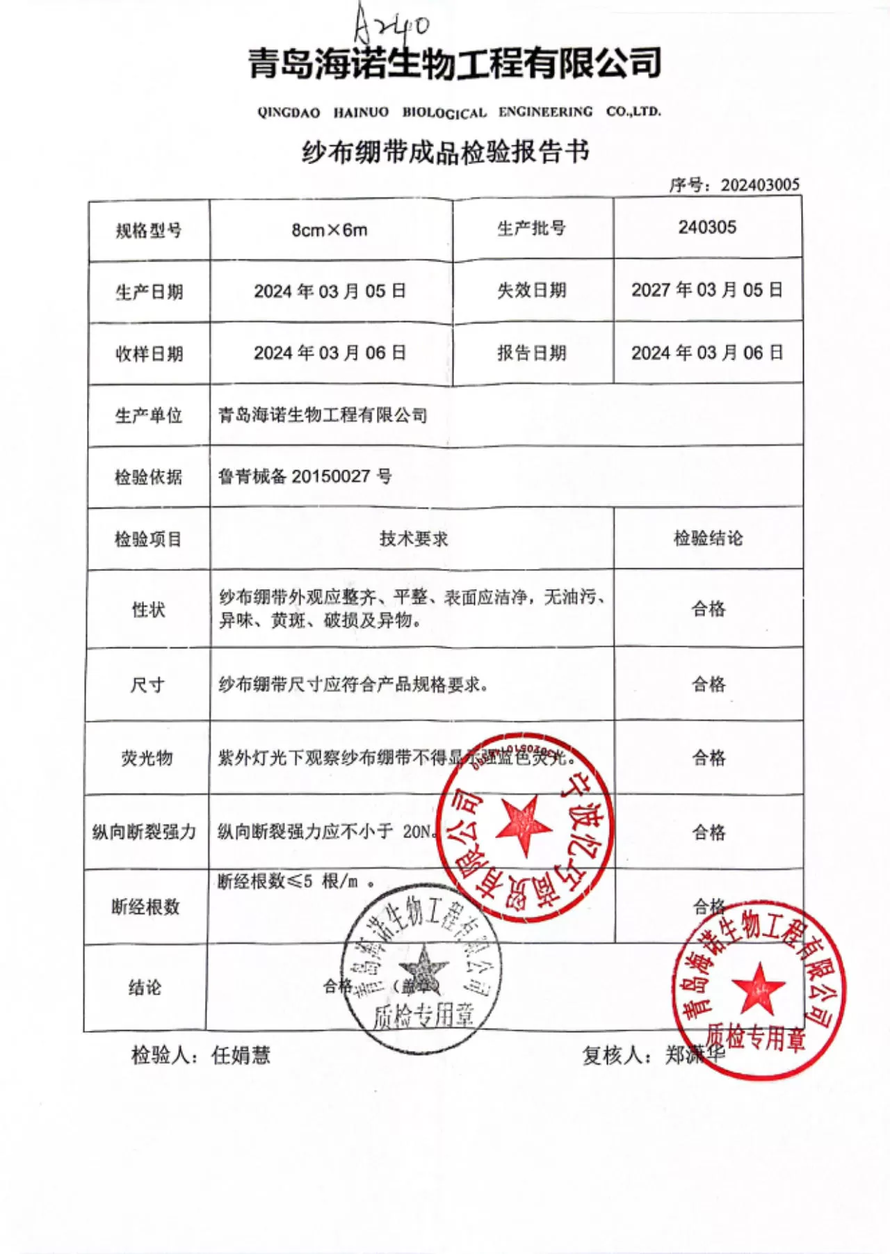 海氏海诺压敏胶带PE透气型1.25*900cm 质检单