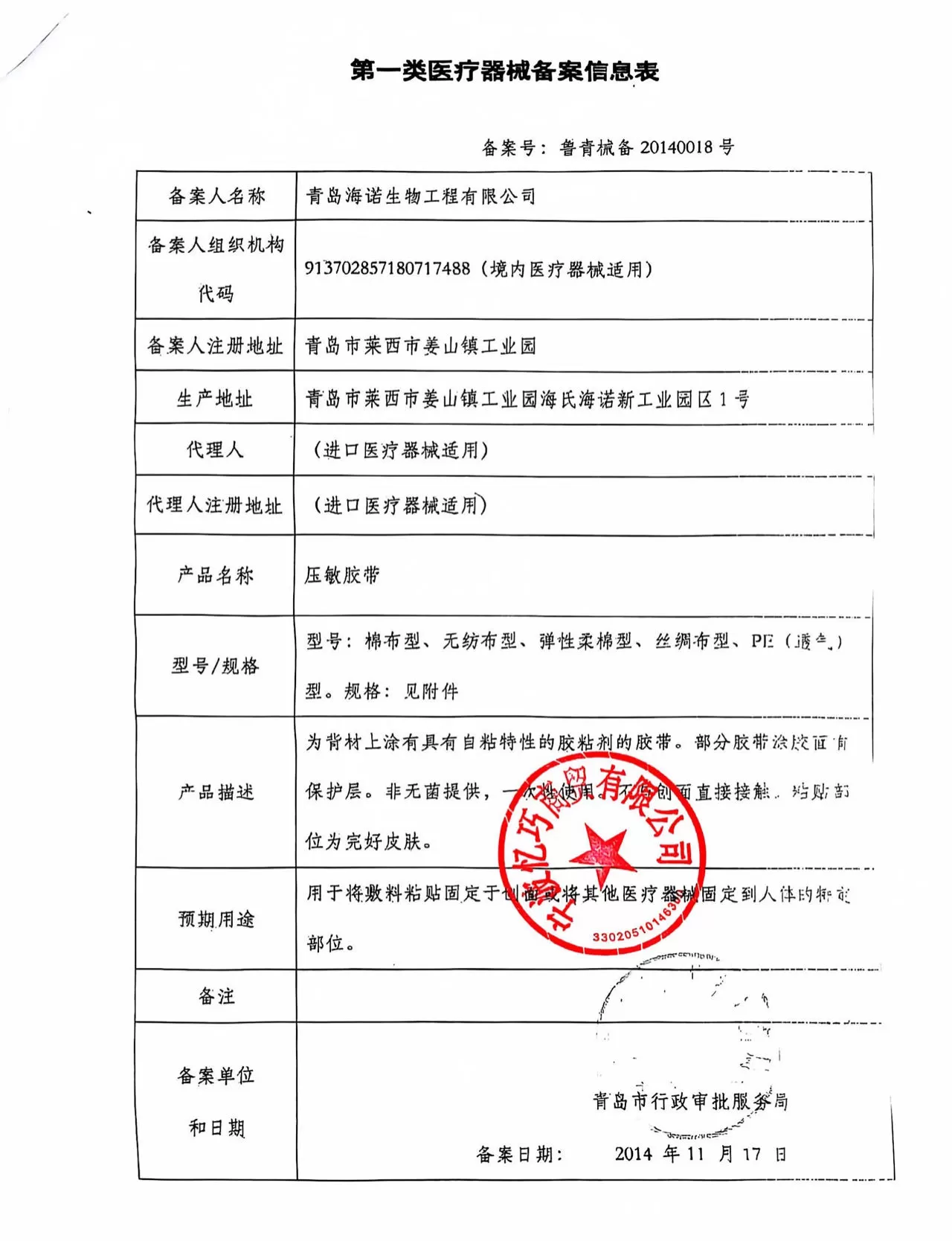 海氏海诺压敏胶带PE透气型1.25*900cm 产品资料