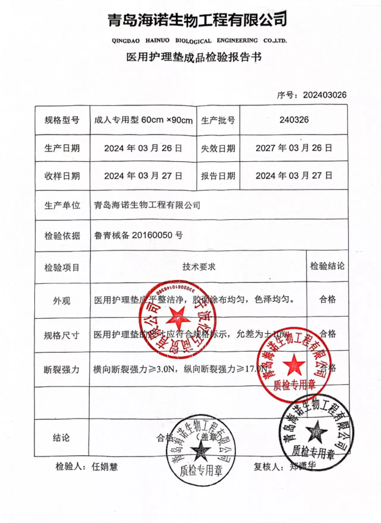 海氏海诺医用护理垫(成人专用型)10片60cm*90cm 质检单
