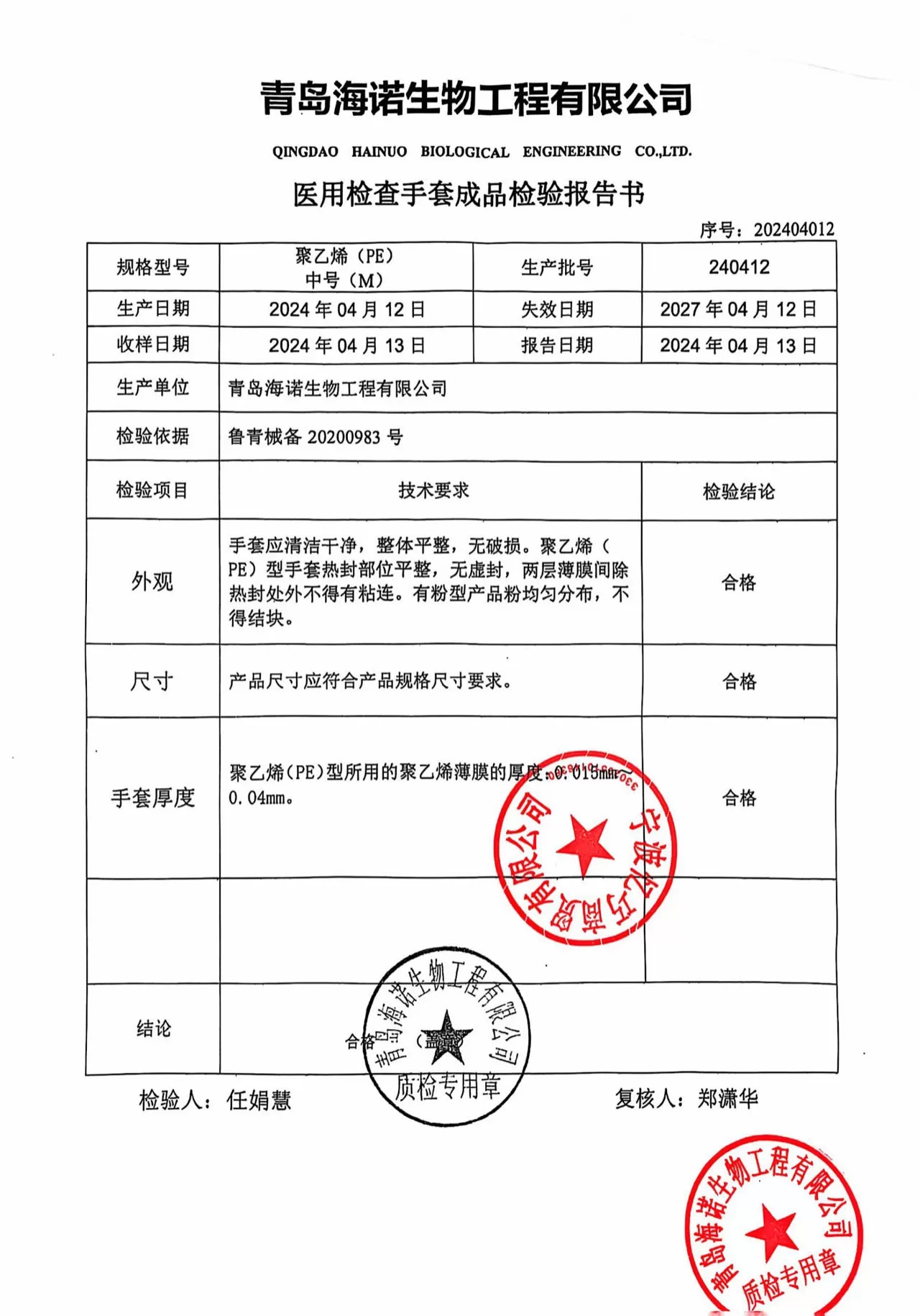 海氏海诺医用检查手套聚乙烯(PE)型中号(M)100只/袋 质检单