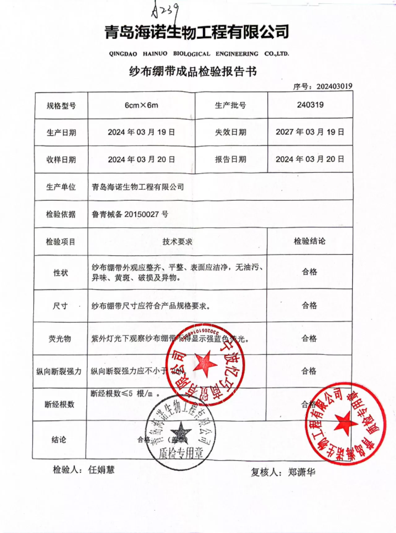 海氏海诺纱布绷带1卷装6cm*6m 质检单