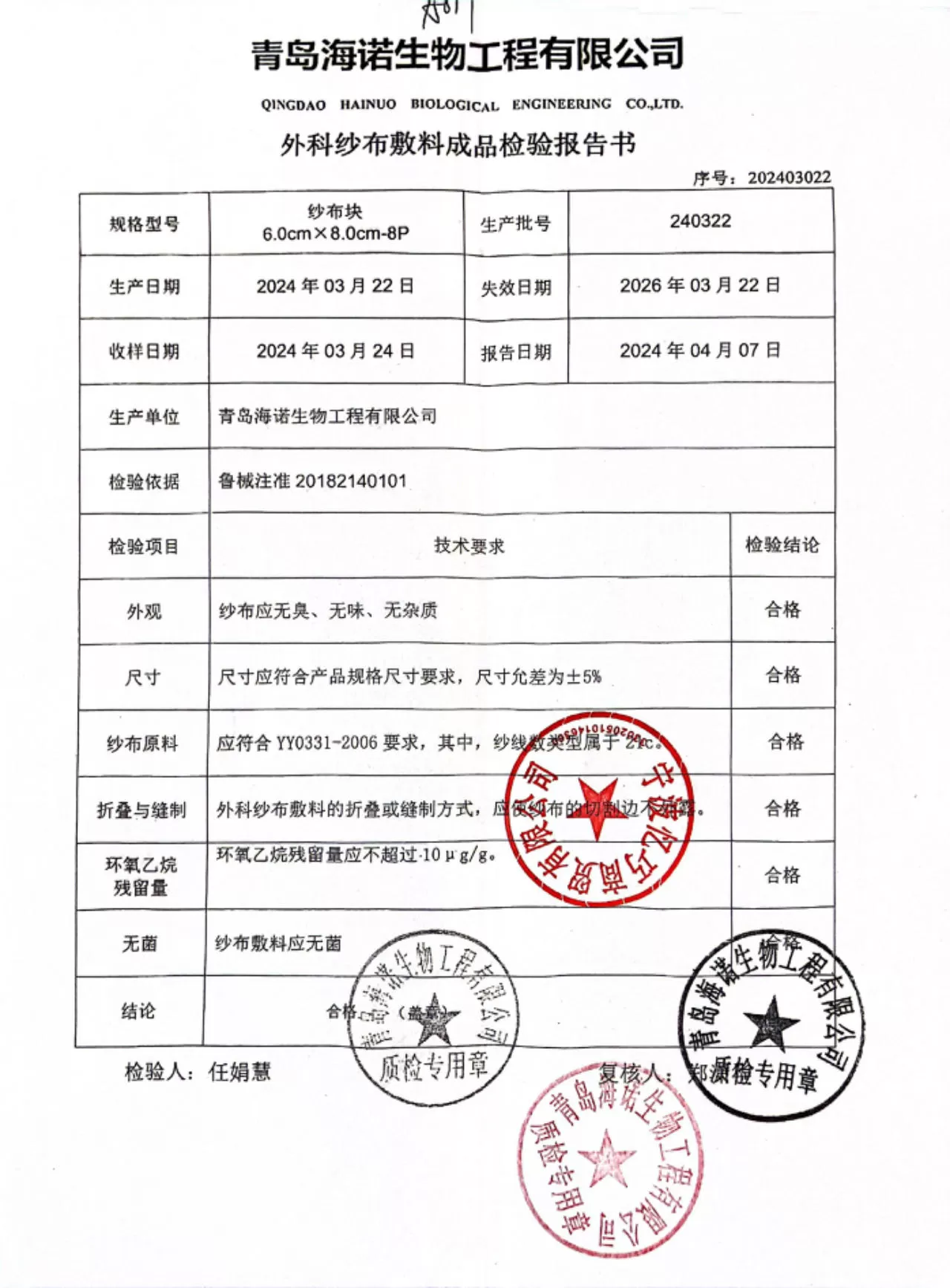 海氏海诺外科纱布敷料纱布块5片/袋6cm*8cm 质检单