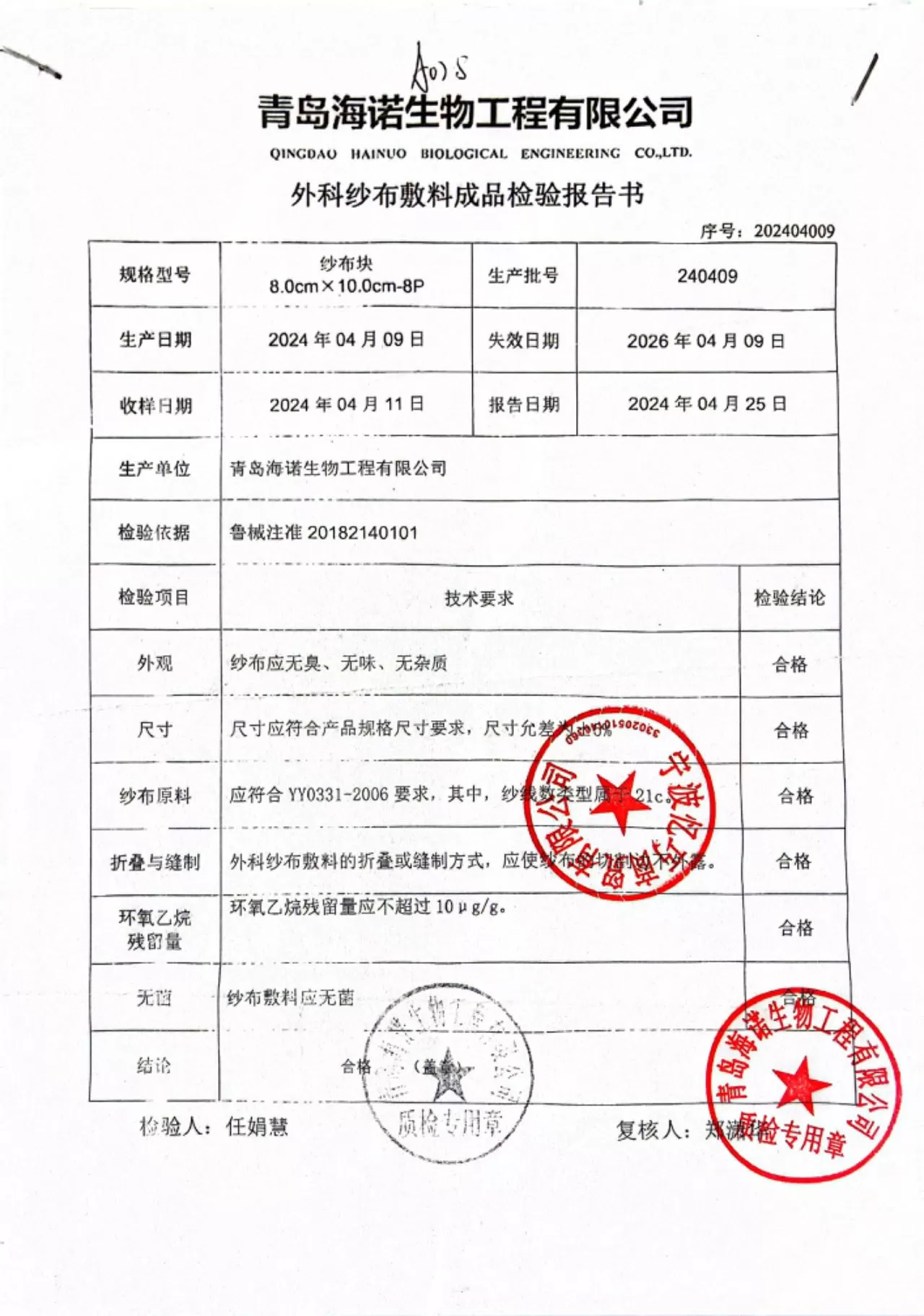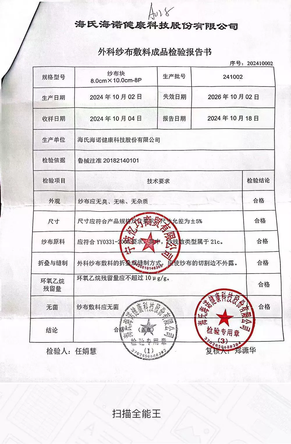 海氏海诺外科纱布敷料纱布块5片装8cm*10cm 质检单