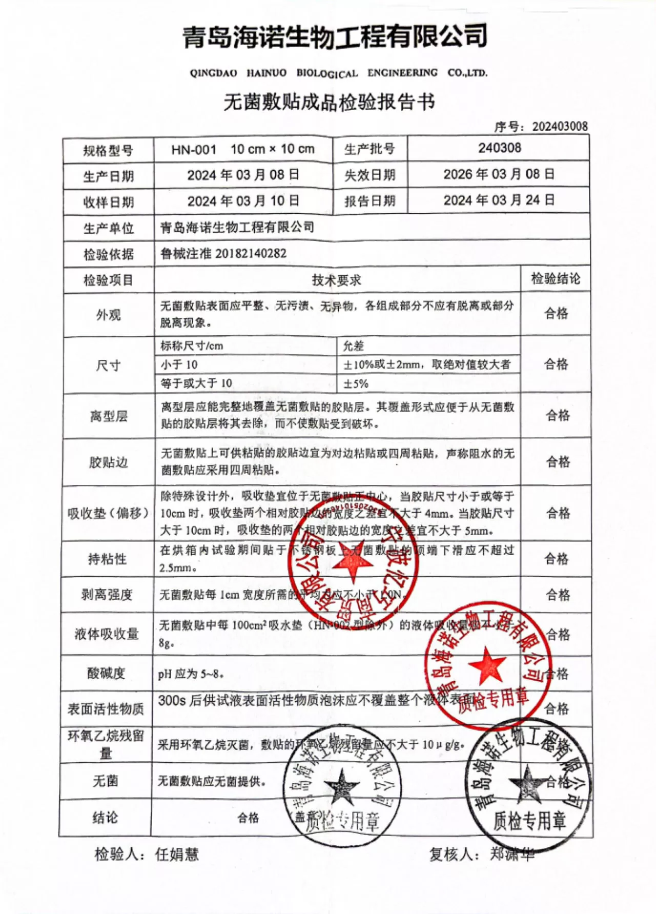 海氏海诺无菌敷贴10cm*10cm/袋【80片/盒】 质检单