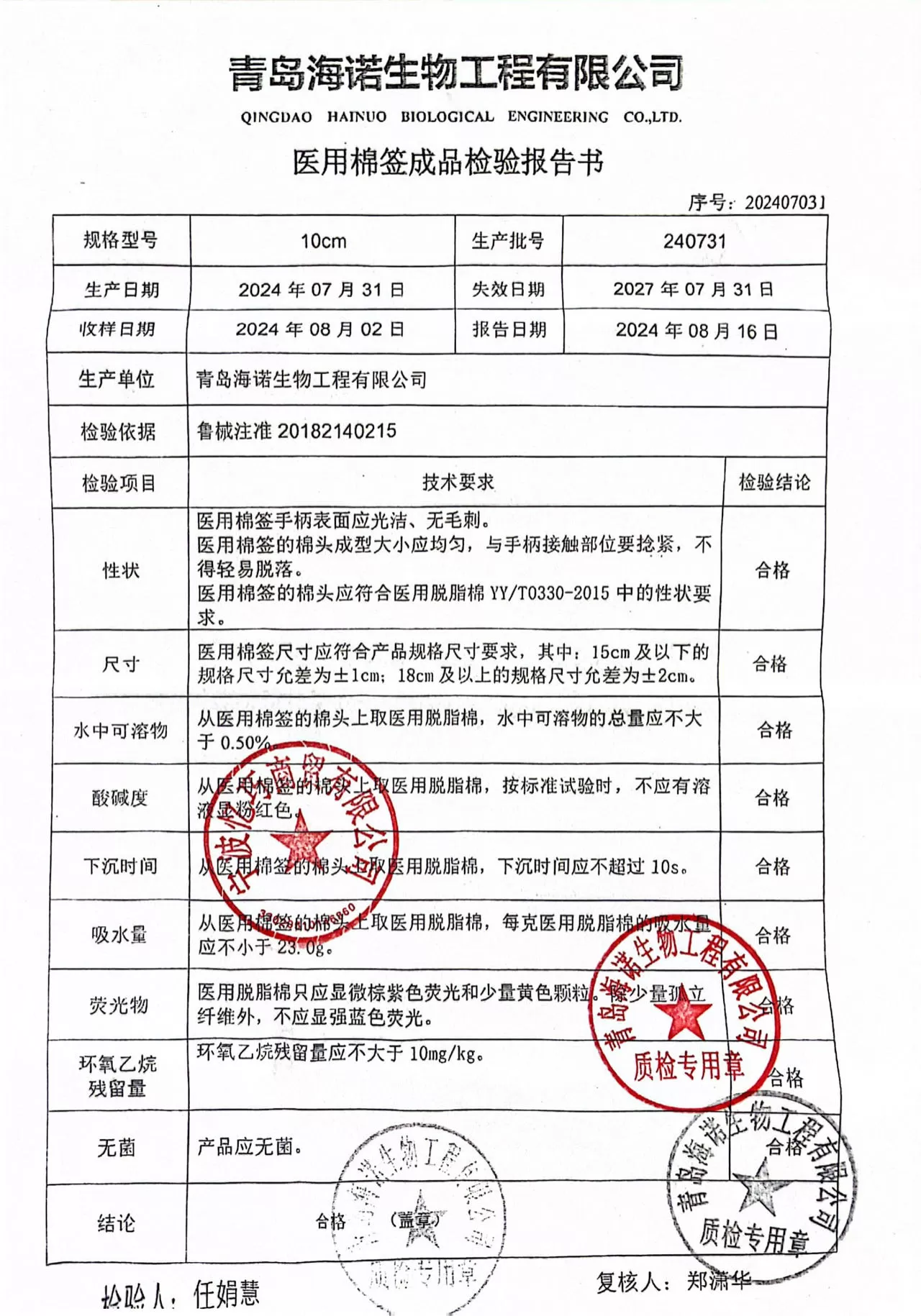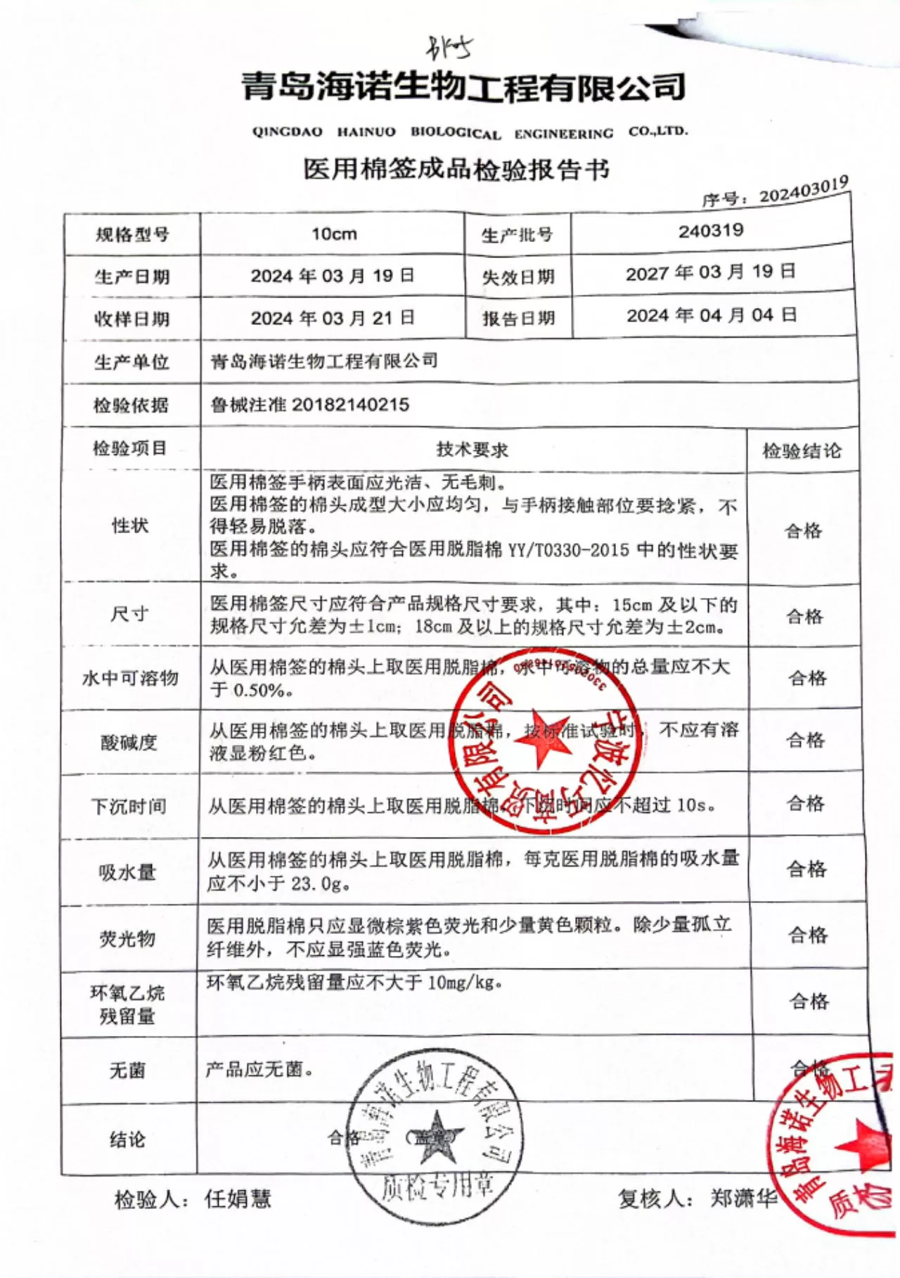 海氏海诺医用棉签二类无菌50支装10cm【40袋/包】 质检单