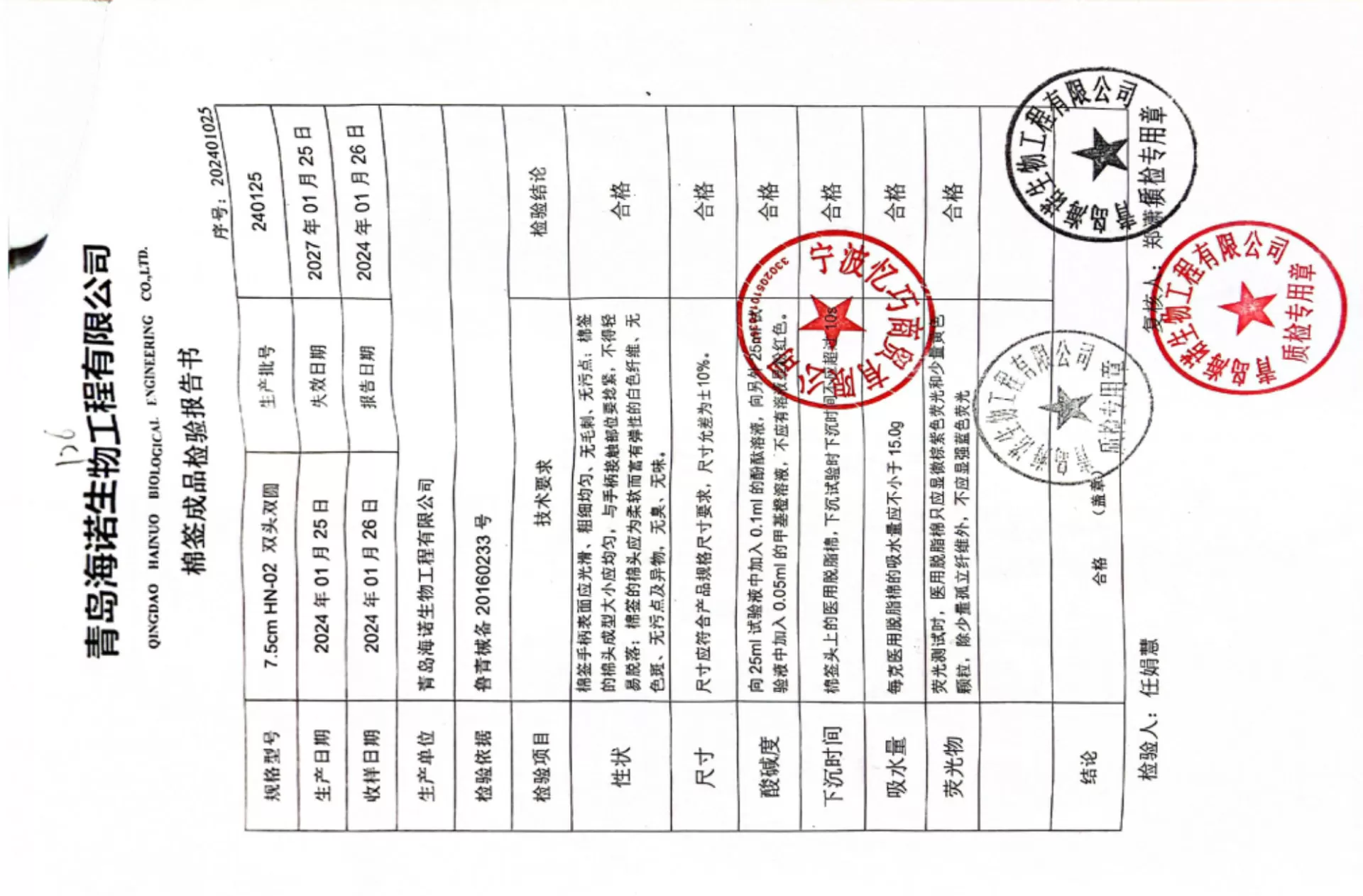 海氏海诺棉签双头双圆100支7.5cm 质检单
