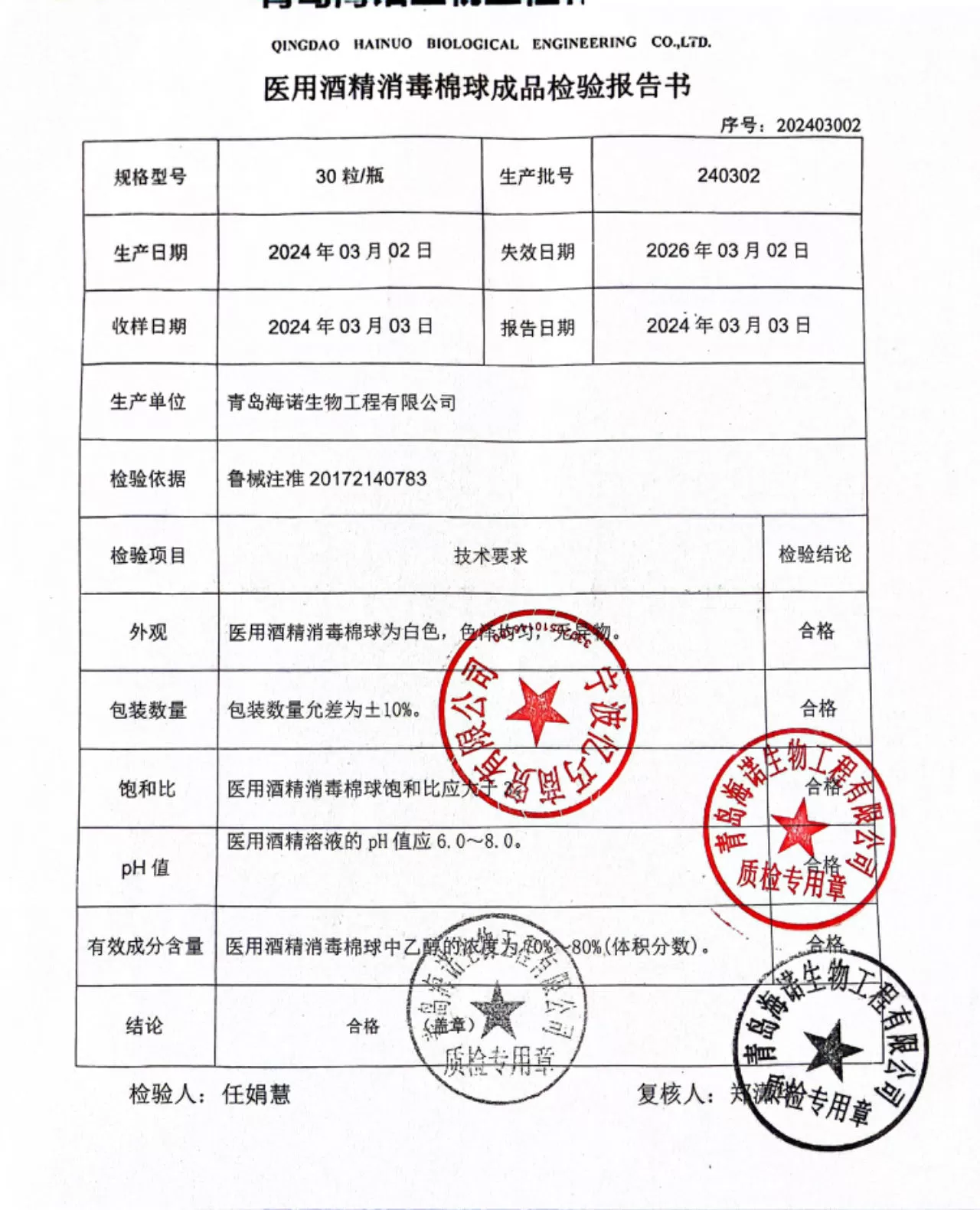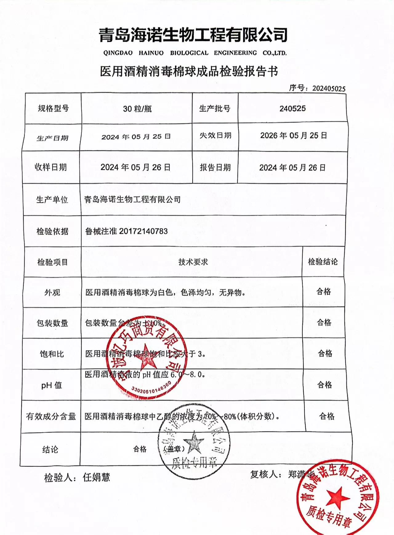 海氏海诺医用酒精消毒棉球30粒/瓶【10送1】 质检单