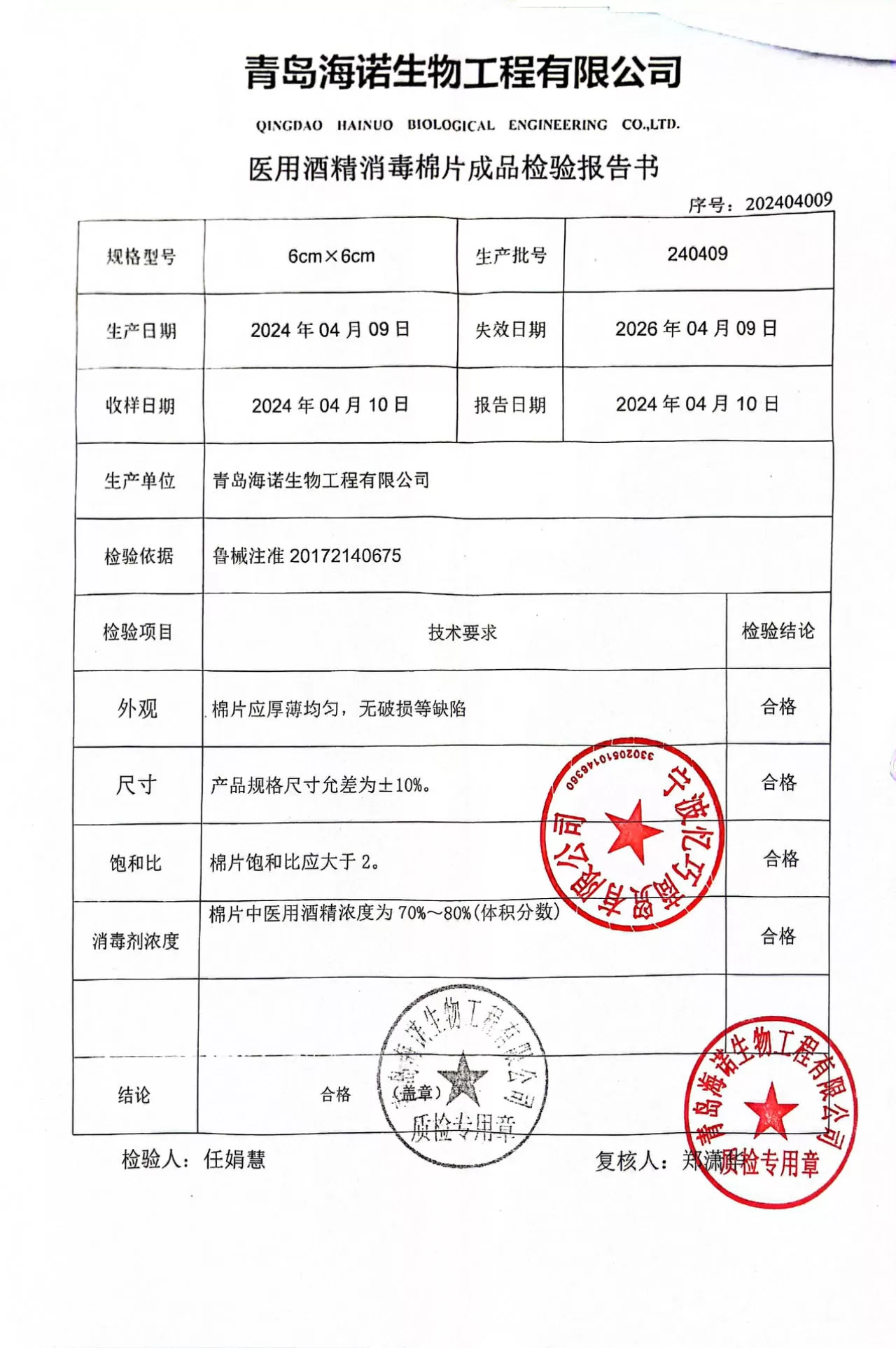 海氏海诺医用酒精消毒棉片100片6cm*6cm 质检单