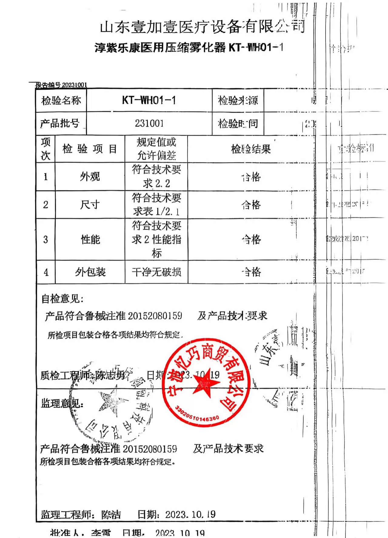 淳紫乐康医用压缩雾化器YJY-Ⅱ型 质检单