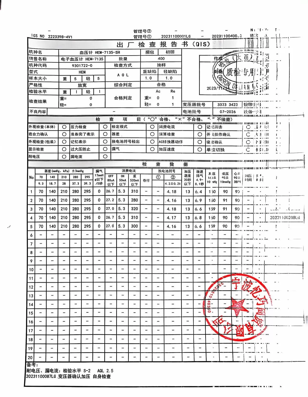 欧姆龙电子血压计上臂式HEM-7135【折后】 质检单