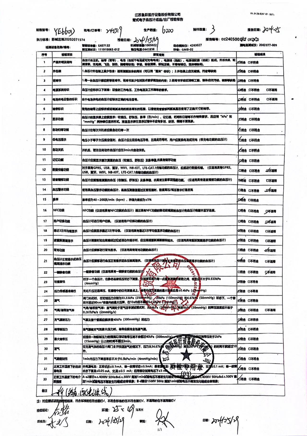鱼跃臂式电子血压计YE660D【带语音配电源线】 质检单