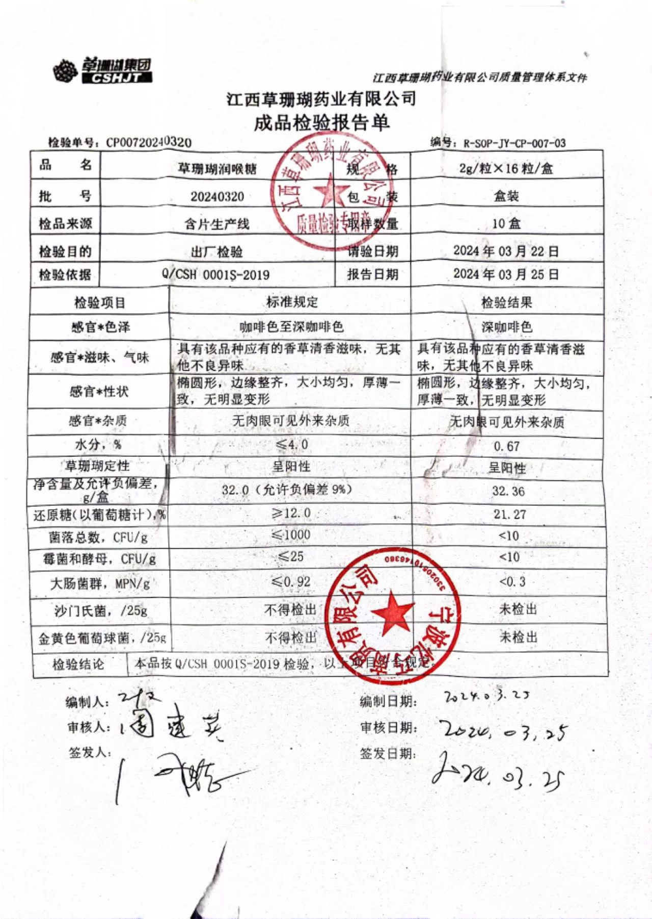 声之宝草珊瑚润喉糖(方铁)2g*16粒 质检单