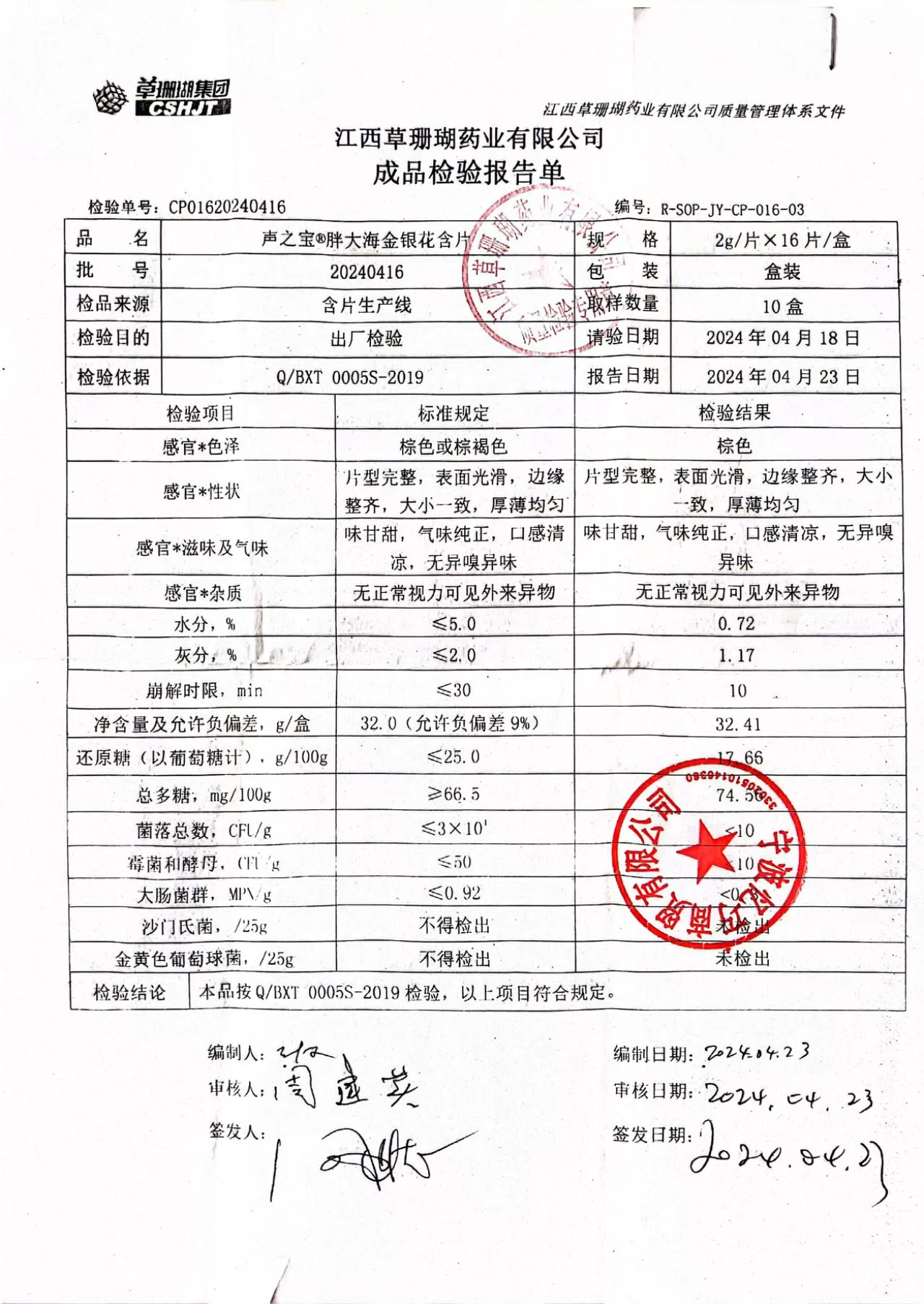 声之宝胖大海金银花含片(方铁)2g*16粒 质检单