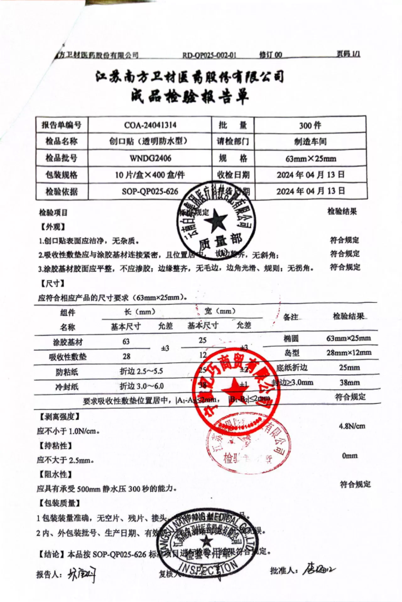云南白药泰邦透明防水创口贴10片/盒 质检单