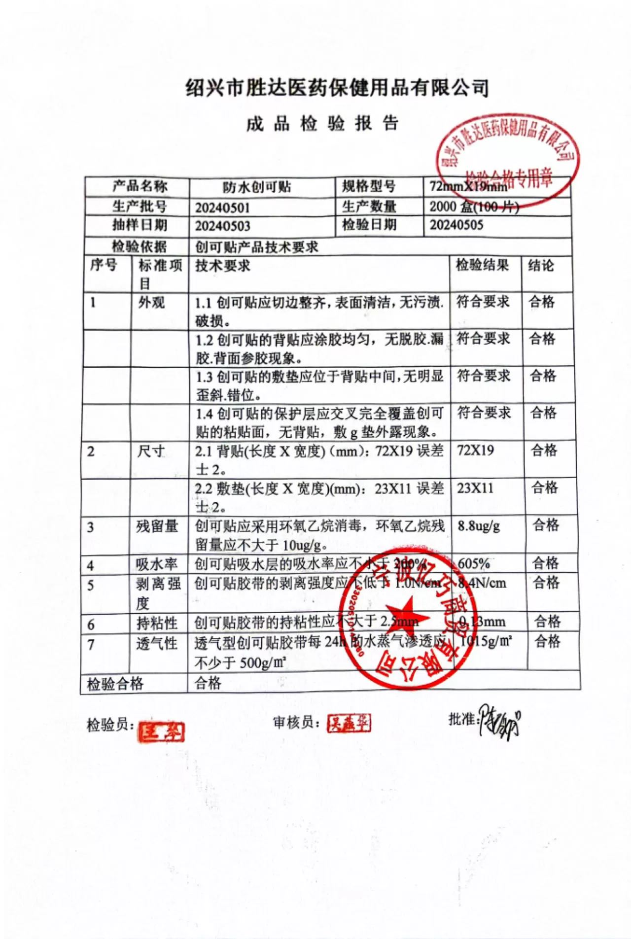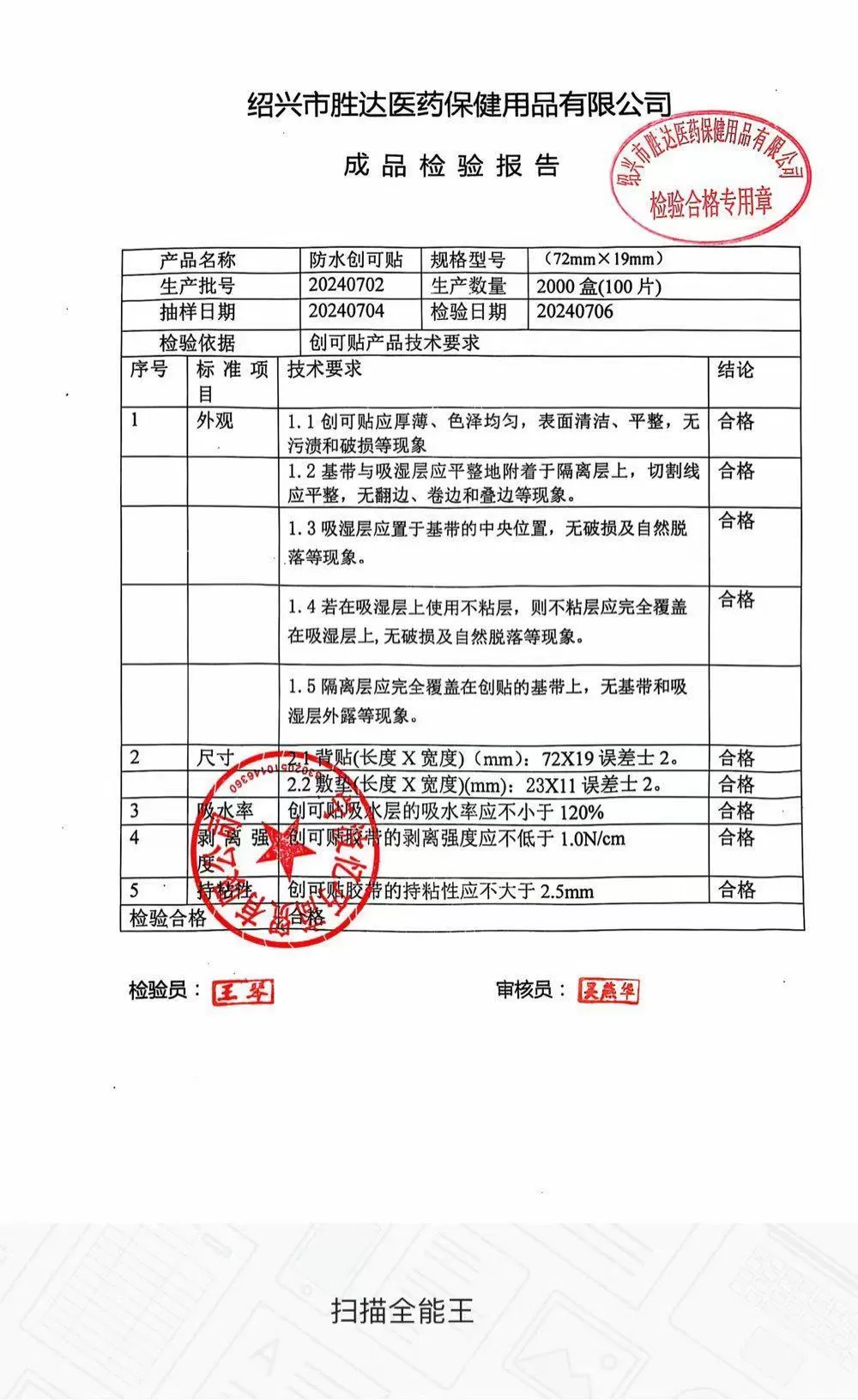 邦亚防水弹性创可贴100片(可刷医保) 质检单