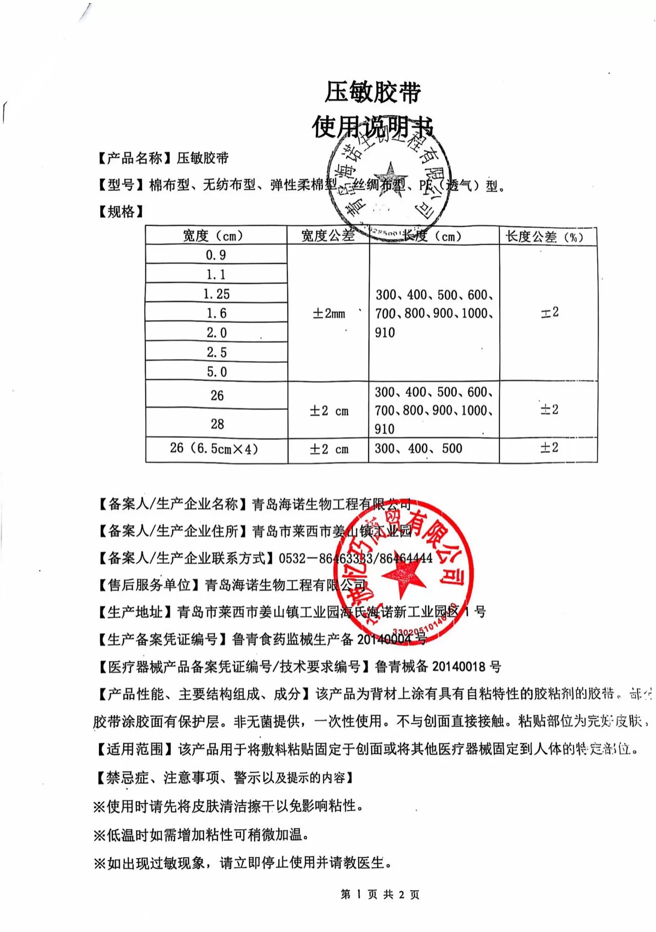 海氏海诺压敏胶带(棉布型)2.0cm*300cm/1卷 产品资料