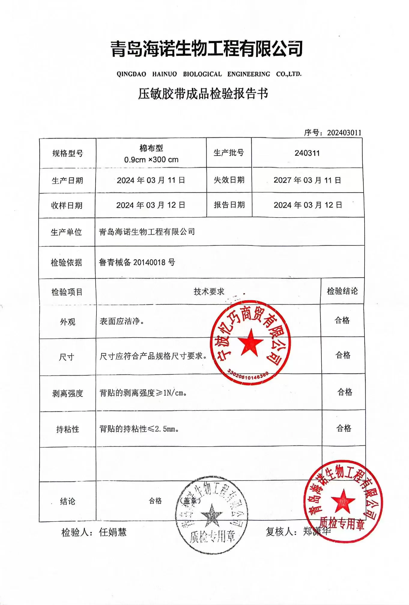 海氏海诺压敏胶带(棉布型)0.9cm*300cm/13卷 质检单