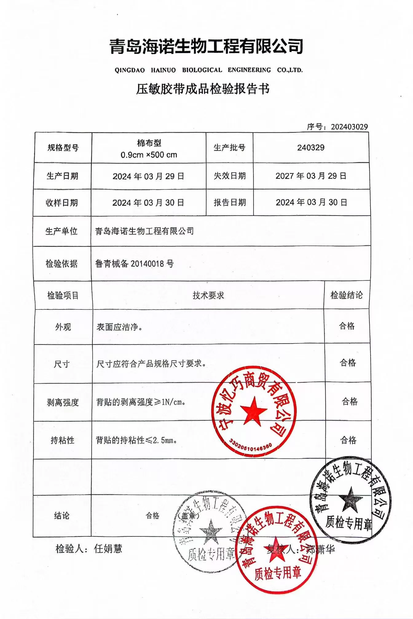 海氏海诺压敏胶带(棉布型)0.9cm*500cm/13卷 质检单