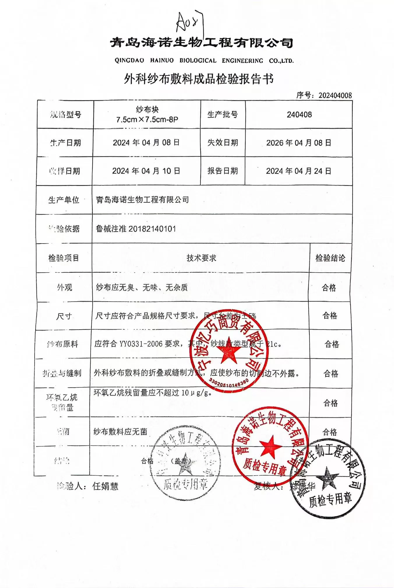 海氏海诺外科敷料纱布块7.5cm/7.5【2片/袋】特价 质检单