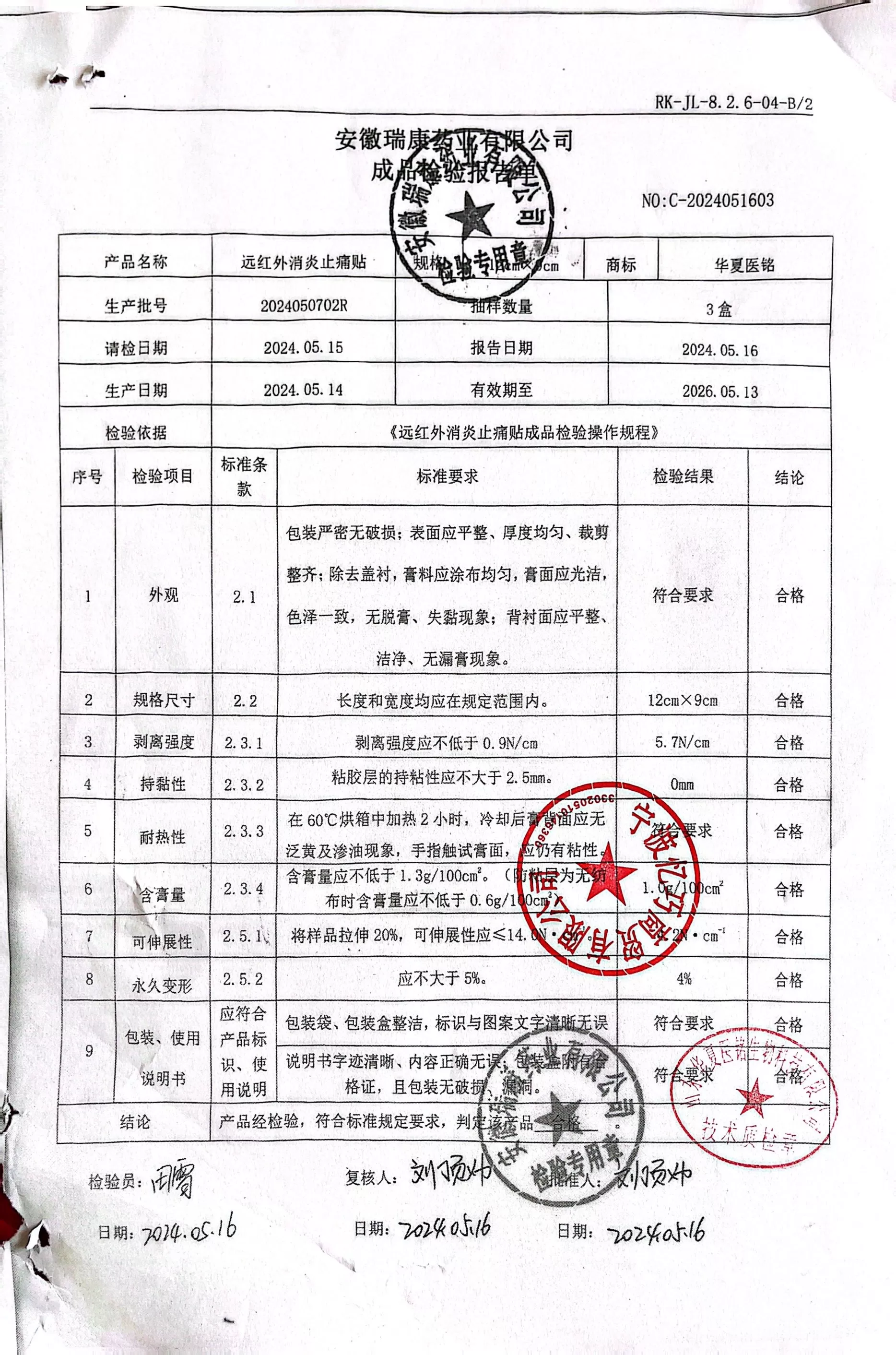 华夏医铭远红外(腰腿痛)8贴/盒【二类器械】 质检单