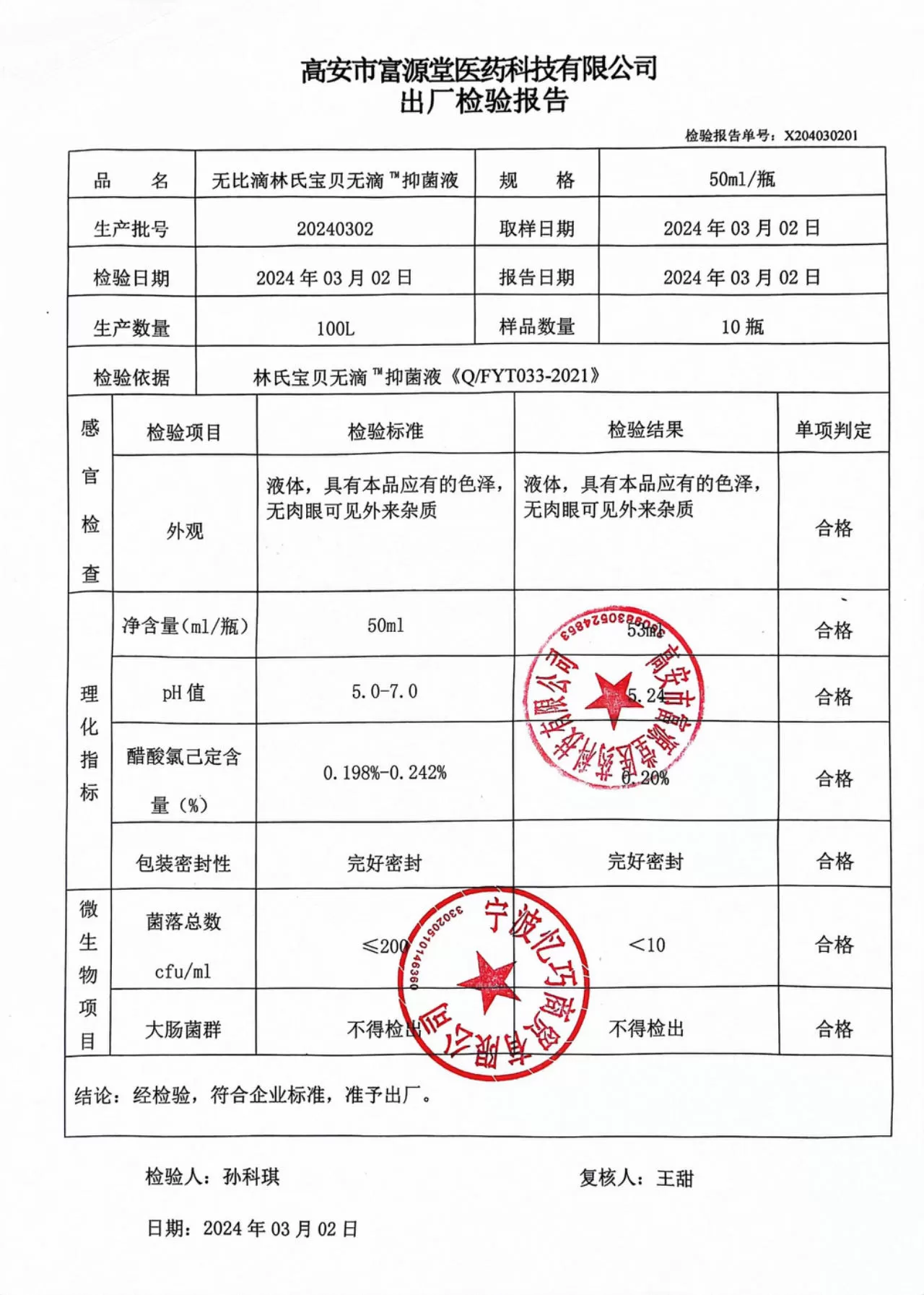 富源堂无比滴抑菌液(儿童)50ML 质检单