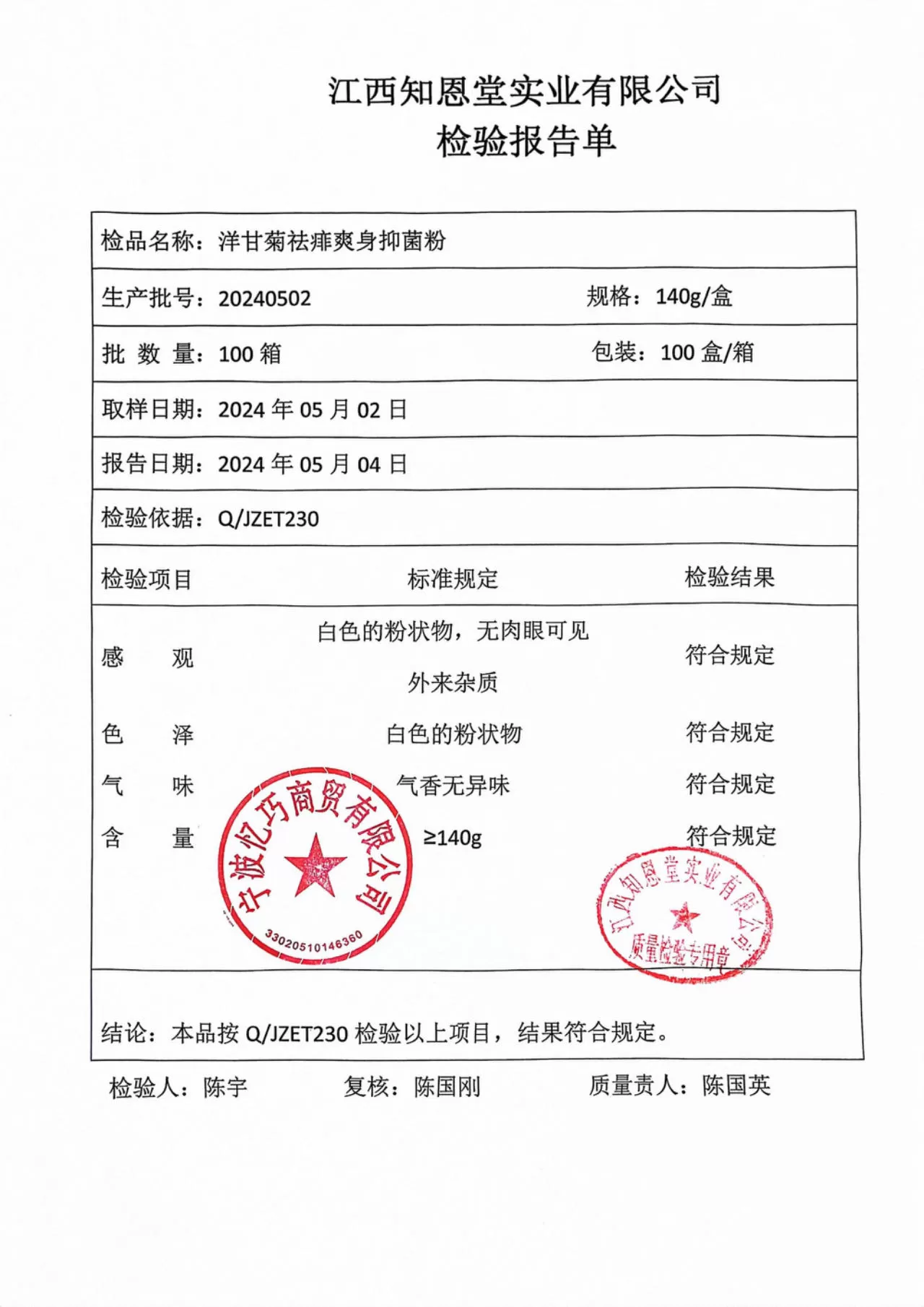 洋甘菊痱子粉爽身粉双效呵护(140g)消字号 质检单