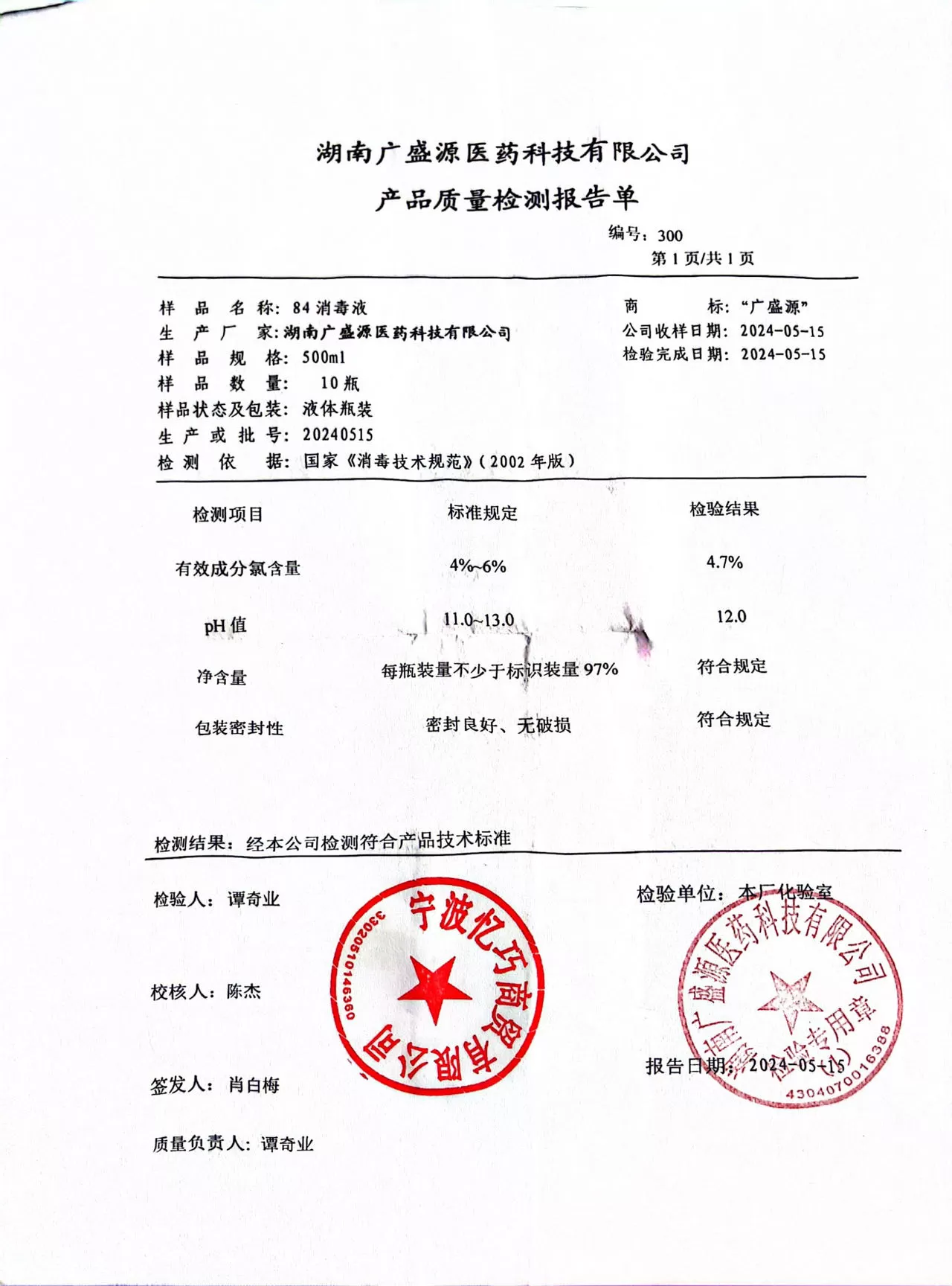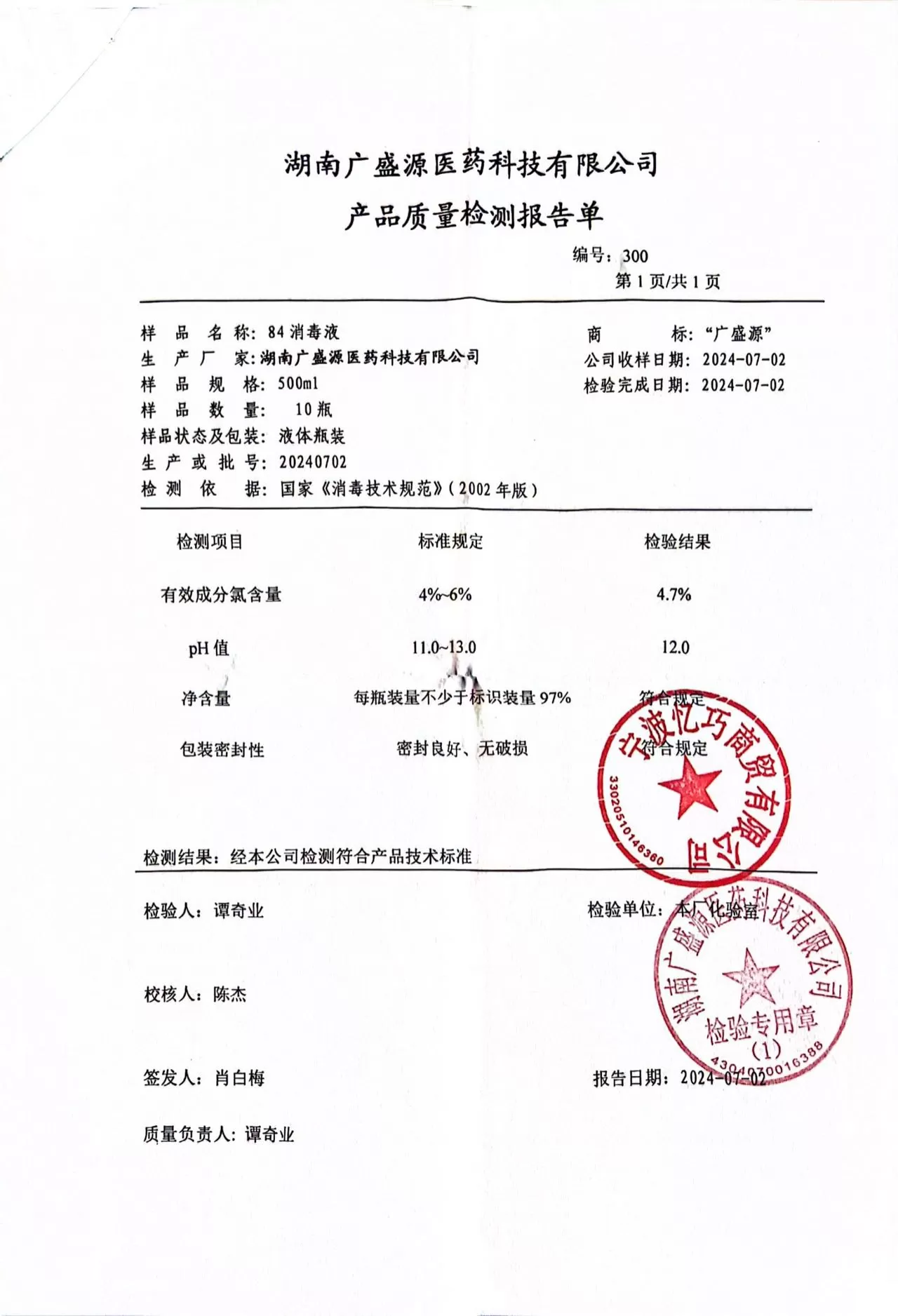 广盛源84消毒液500ml 质检单