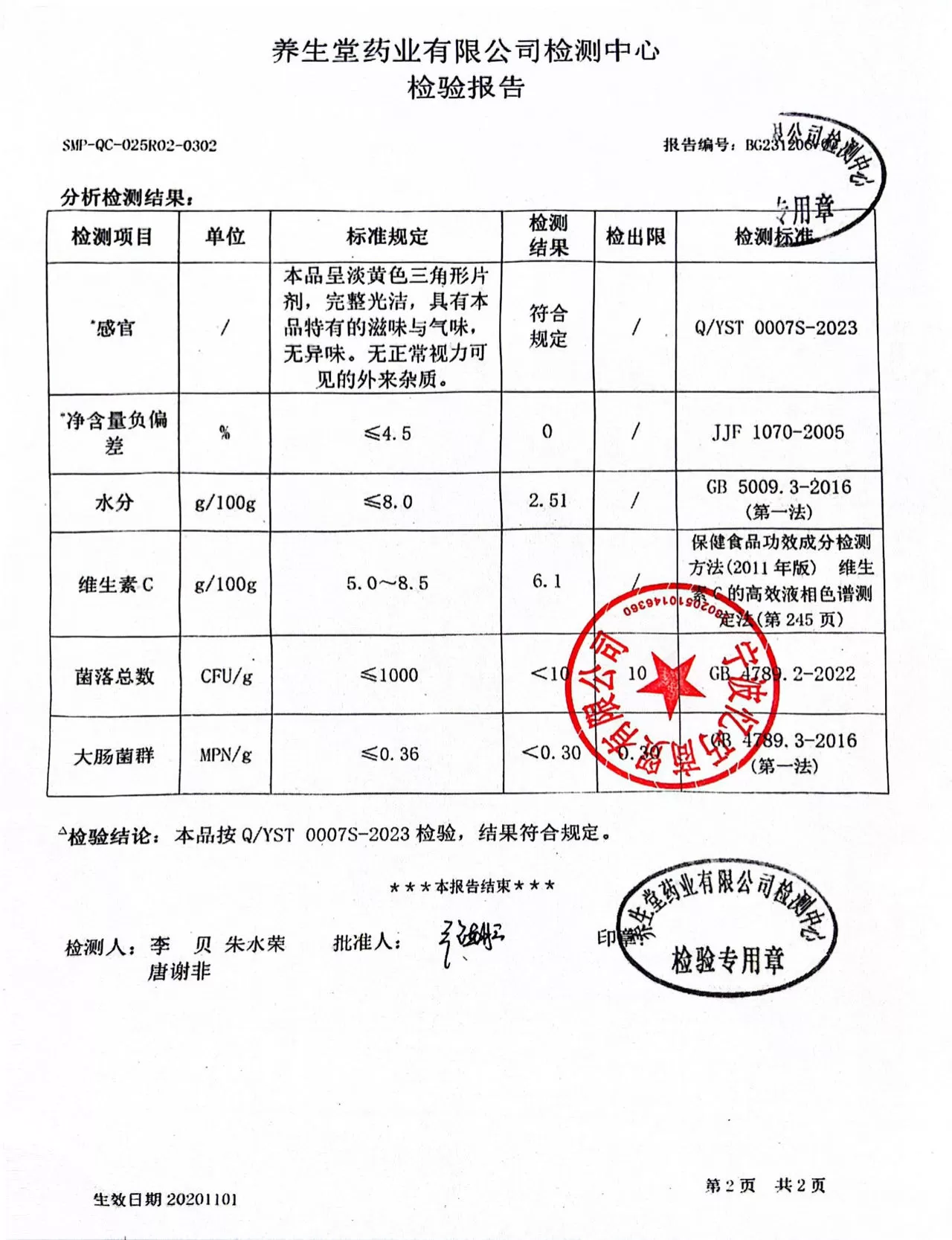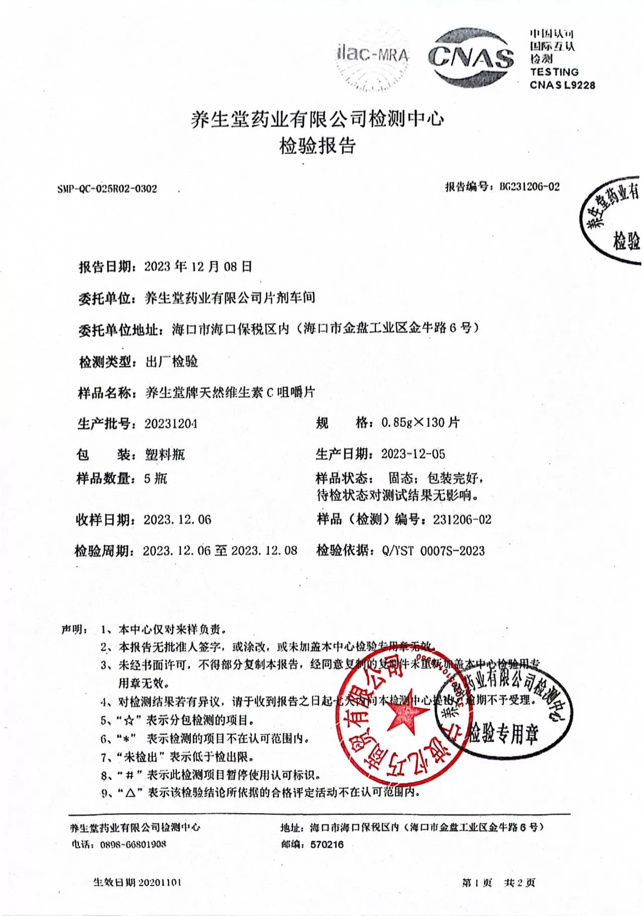 养生堂天然维生素C咀嚼片(130粒)禁退 质检单