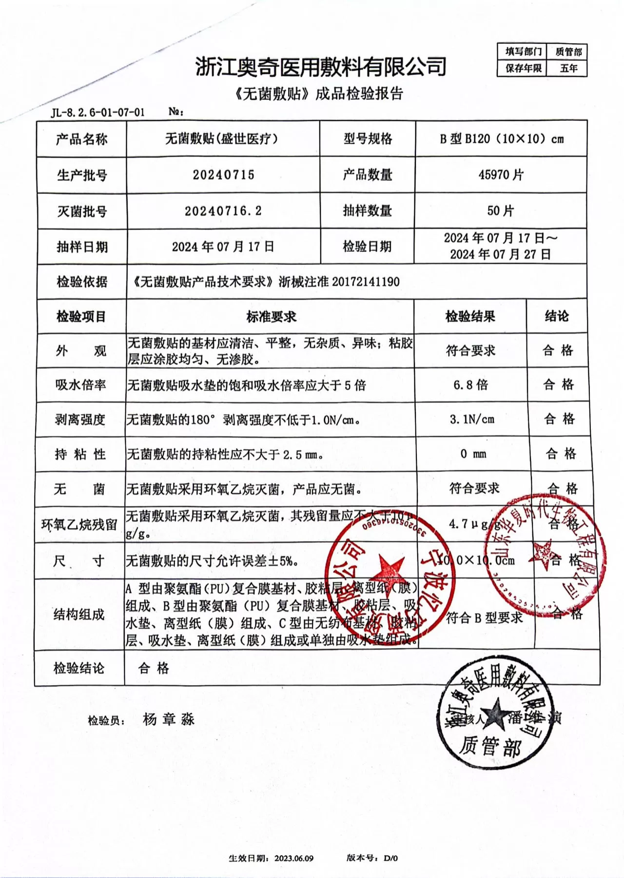 盛世医疗医用PU防水无菌敷贴(中)10cm*10cm/20片 质检单