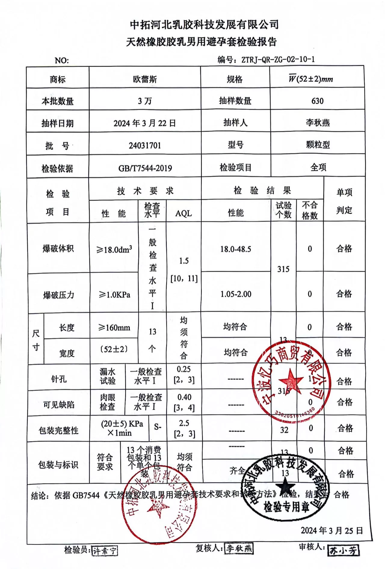 欧蕾斯激情装天然乳胶避孕套(12只) 质检单