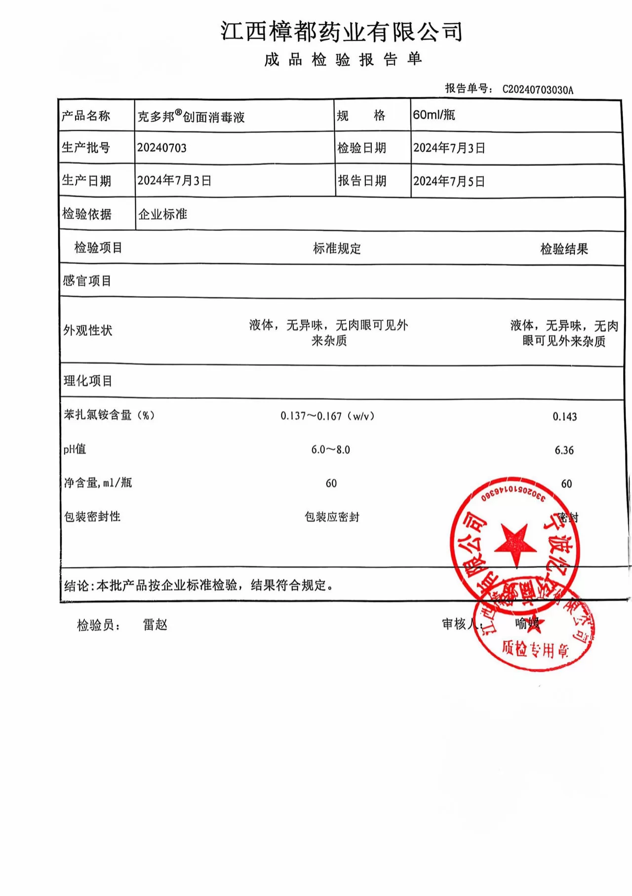 克多邦伤口创面消毒液60ml【消字号】【5送1】 质检单