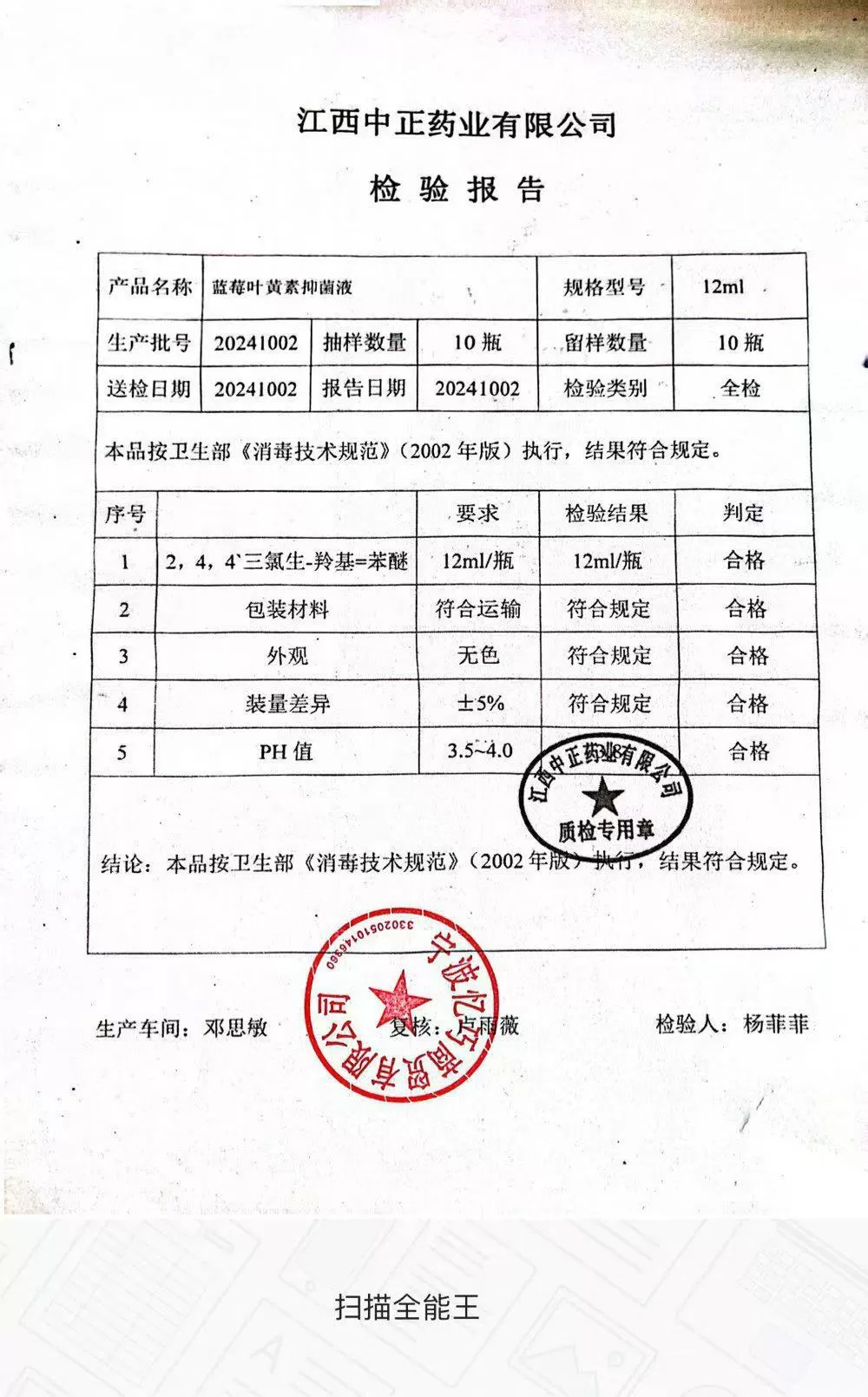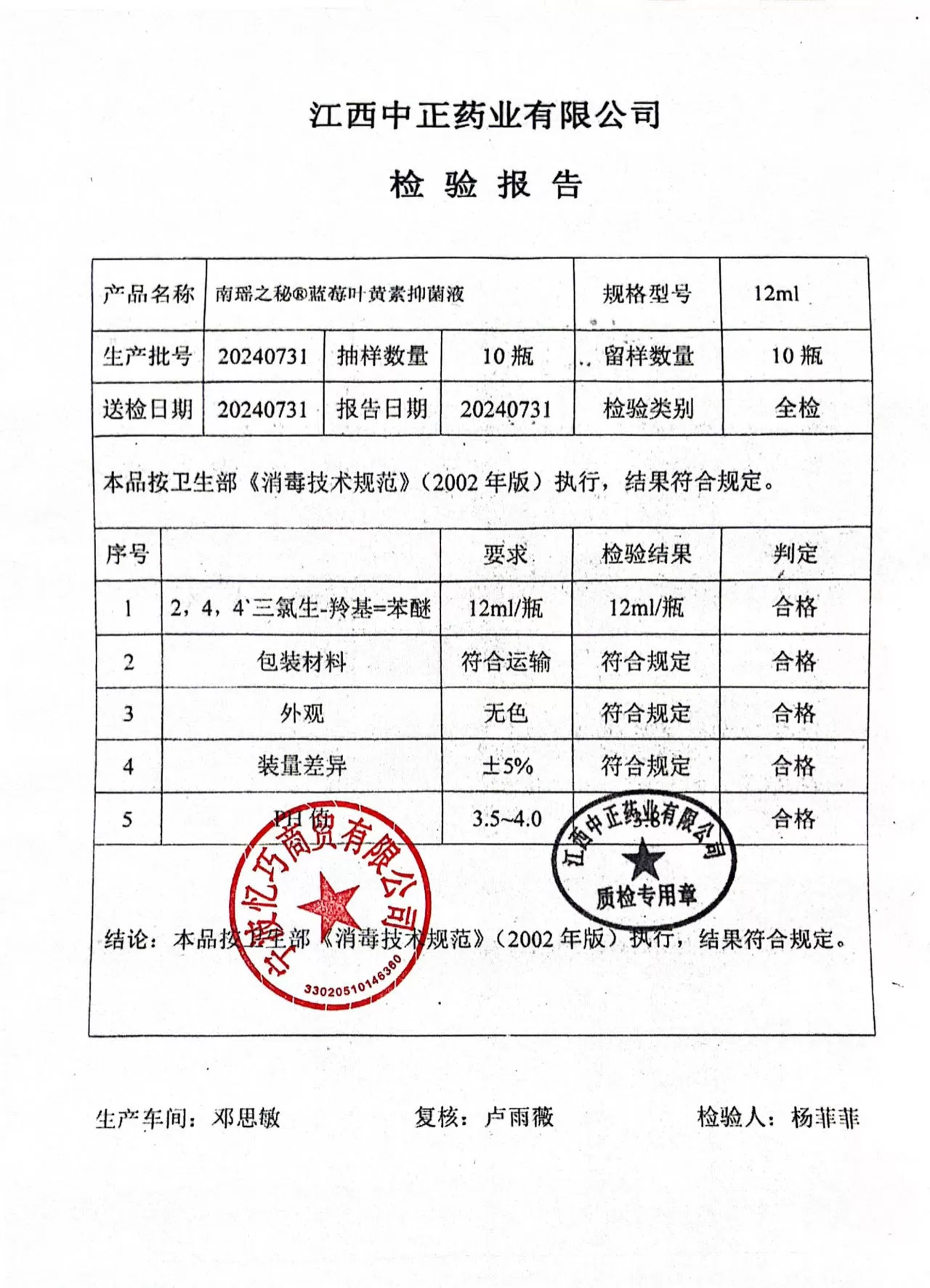 南遥之秘蓝莓叶黄素抑菌液12ml【消字号】 质检单