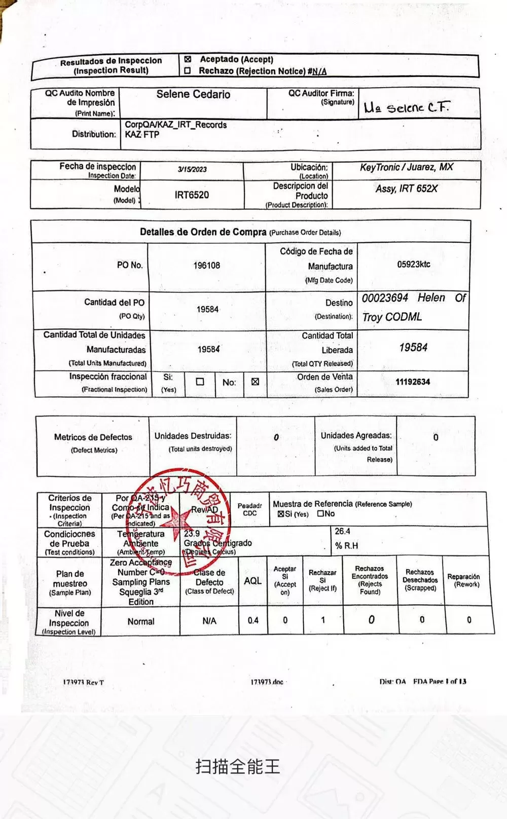 博朗耳温枪体温计IRT6520【折后价】 质检单