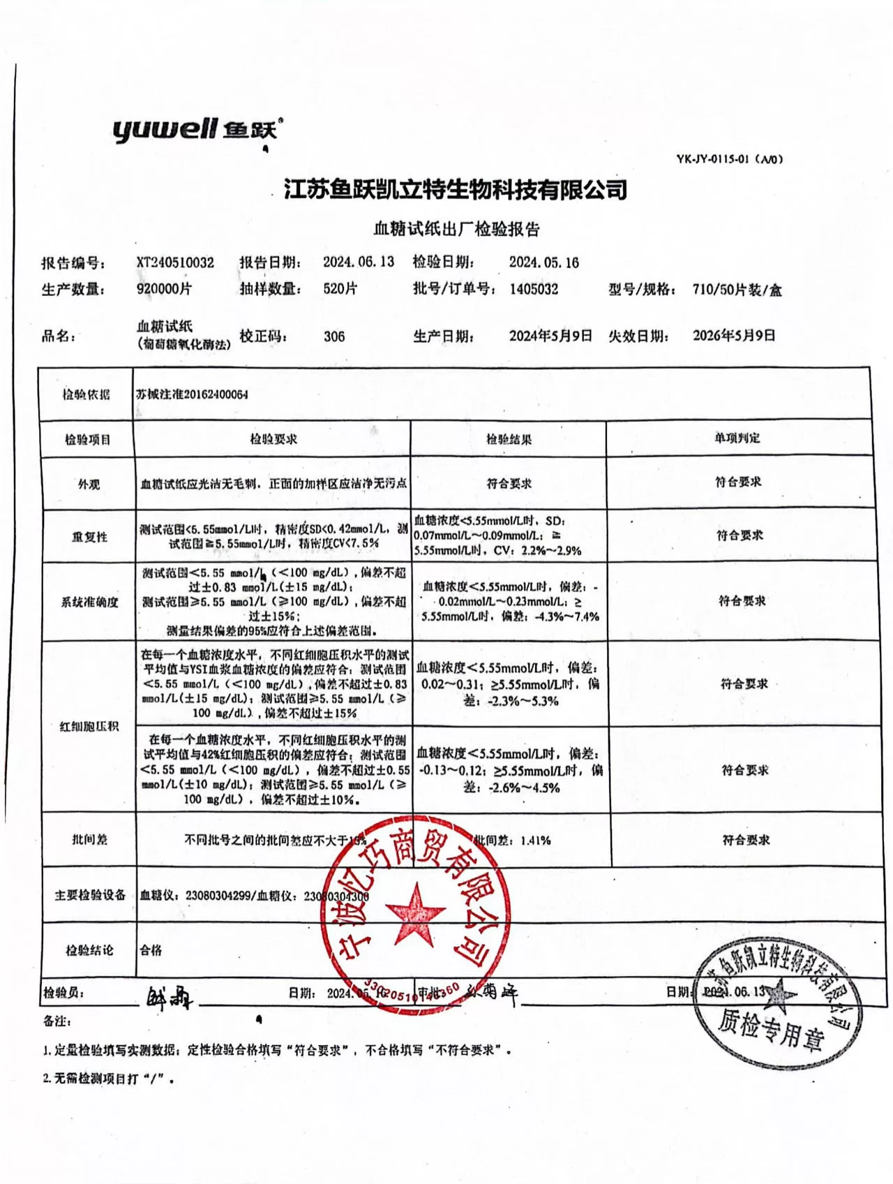 鱼跃血糖710测试条试纸【订4盒送1台机器】 质检单