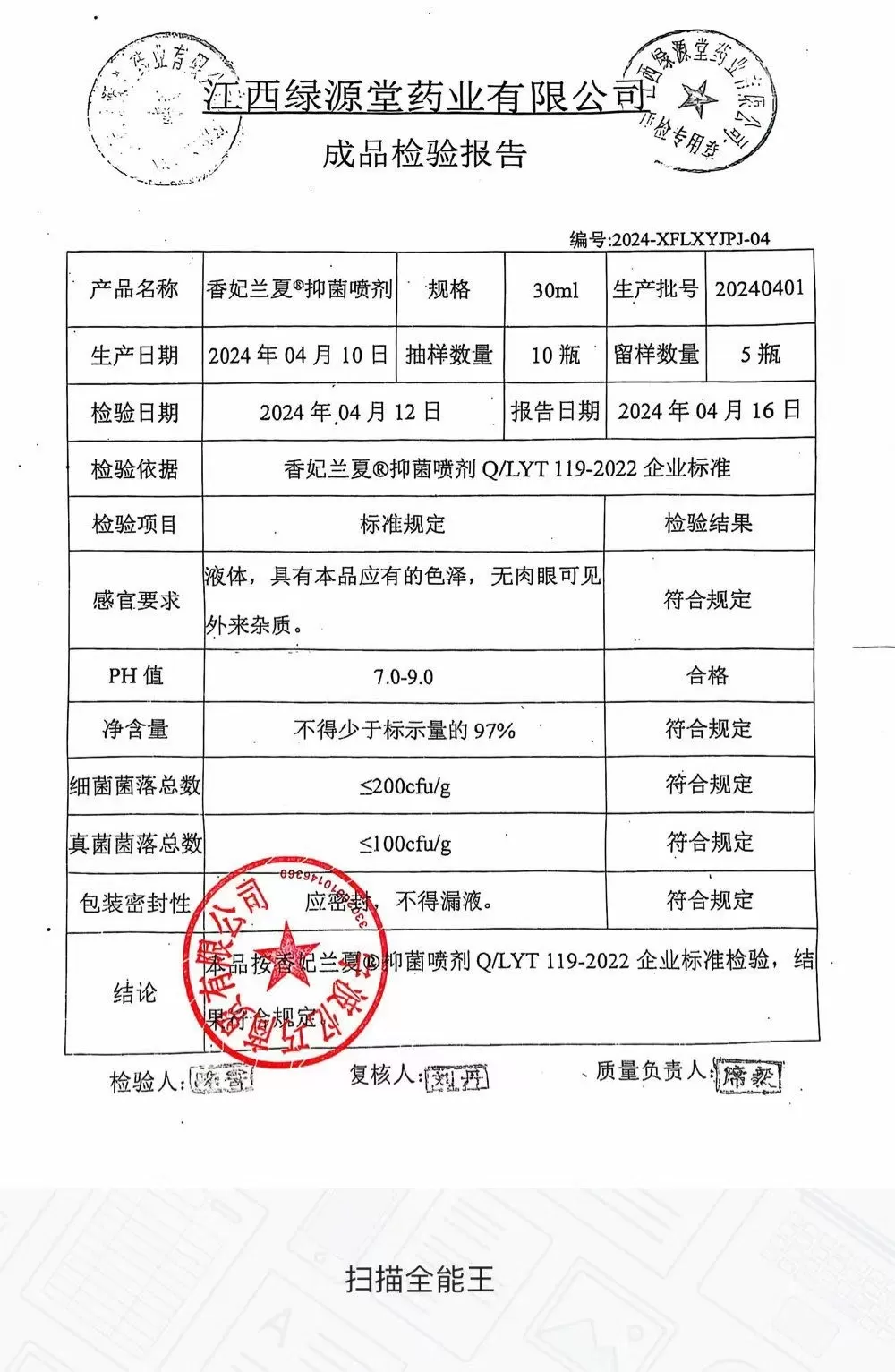 香妃兰夏抑菌喷剂30ml【消字号】 质检单
