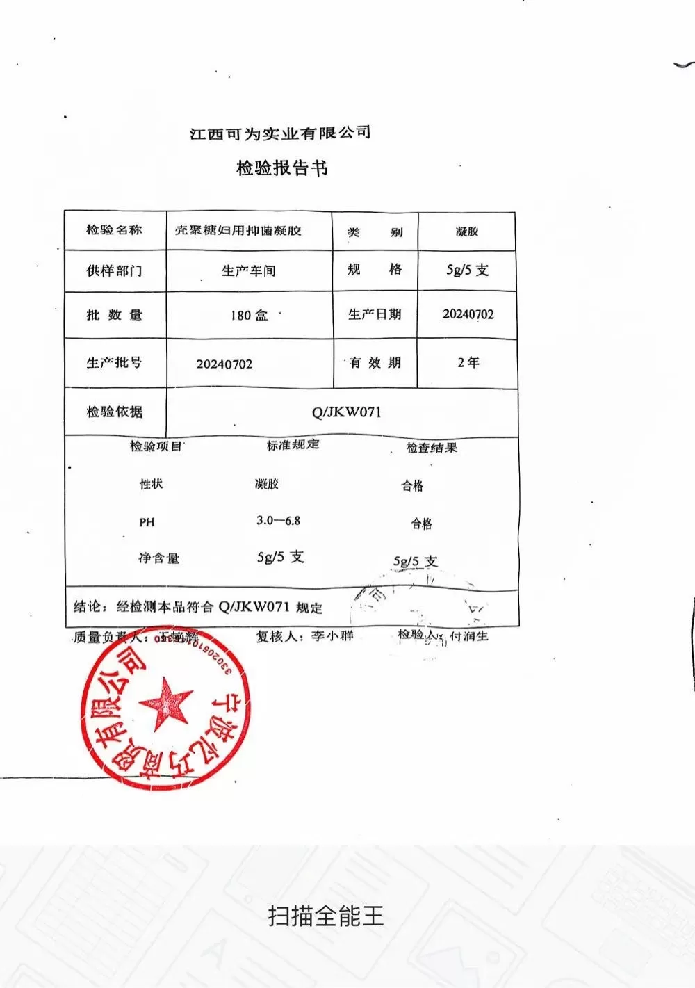 可为善美壳聚糖妇用凝胶5g/5支【消字号】 质检单