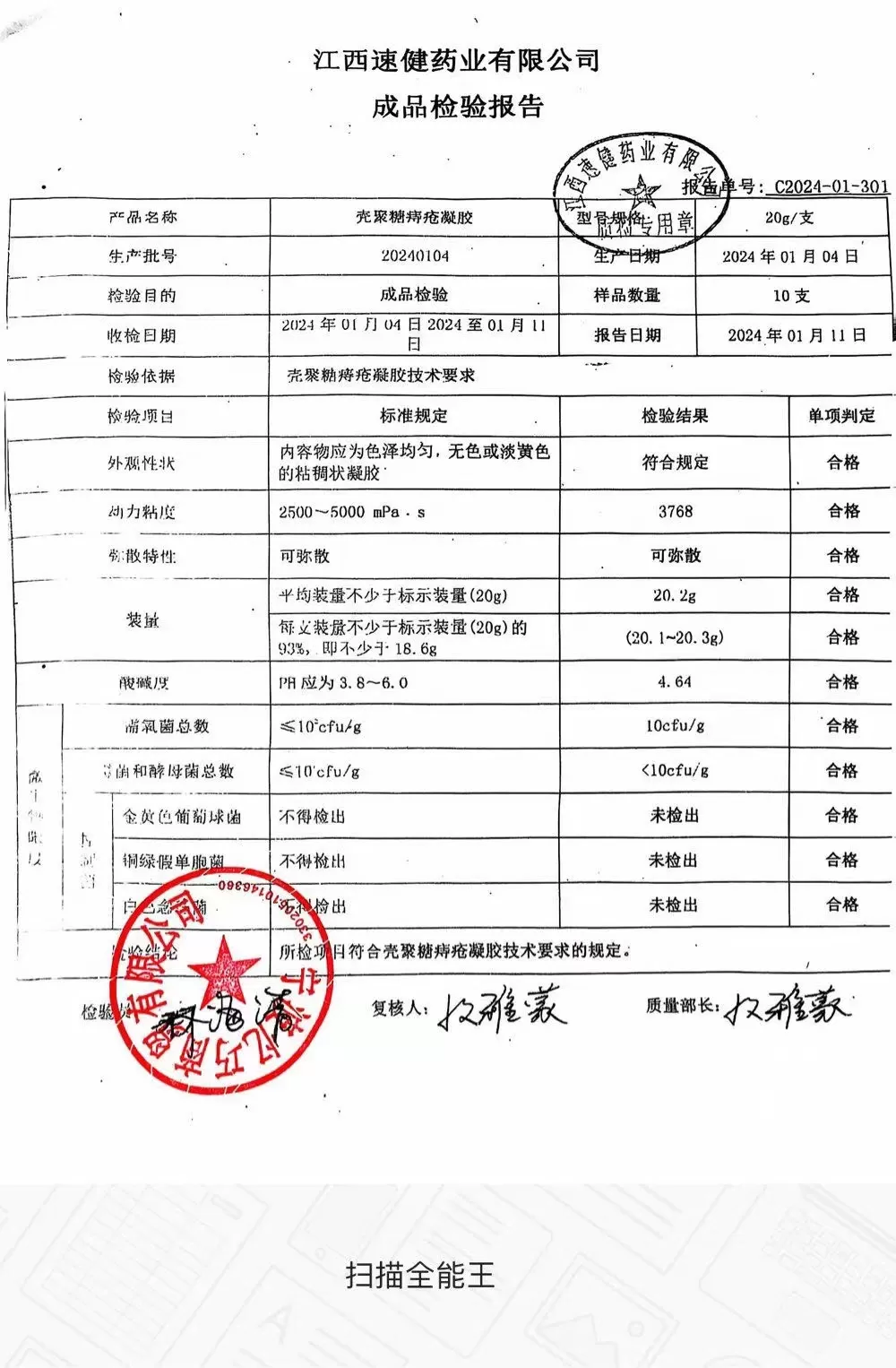 华北制药壳聚糖痔疮凝胶20g【二类器械】 质检单