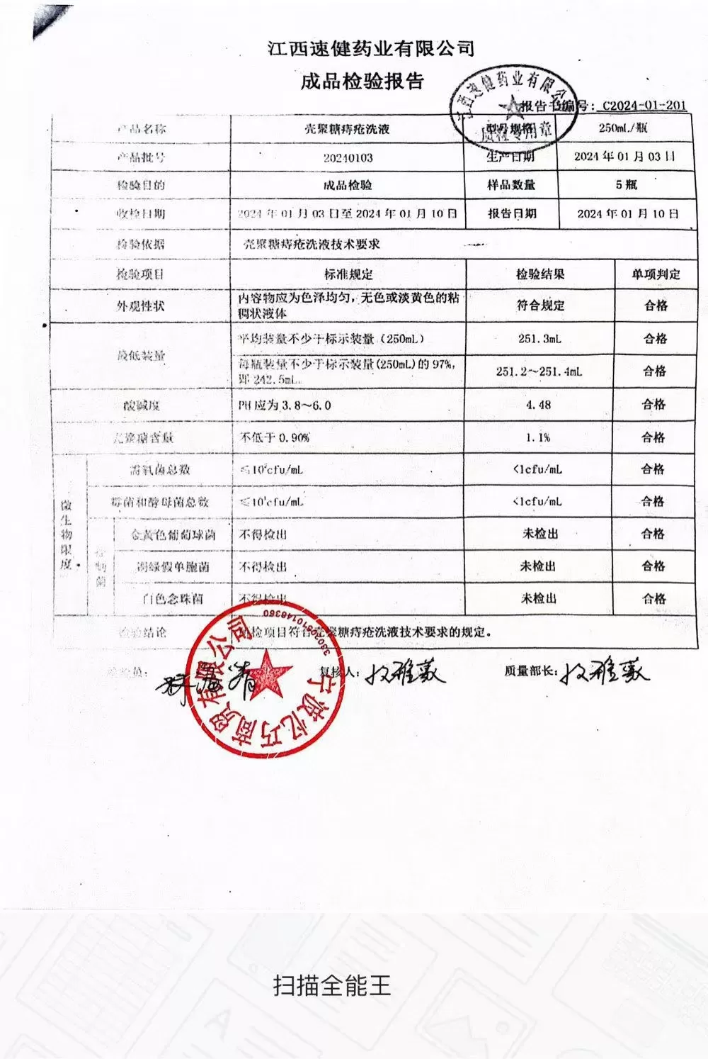 华北制药壳聚糖痔疮洗液250ML【二类器械】 质检单