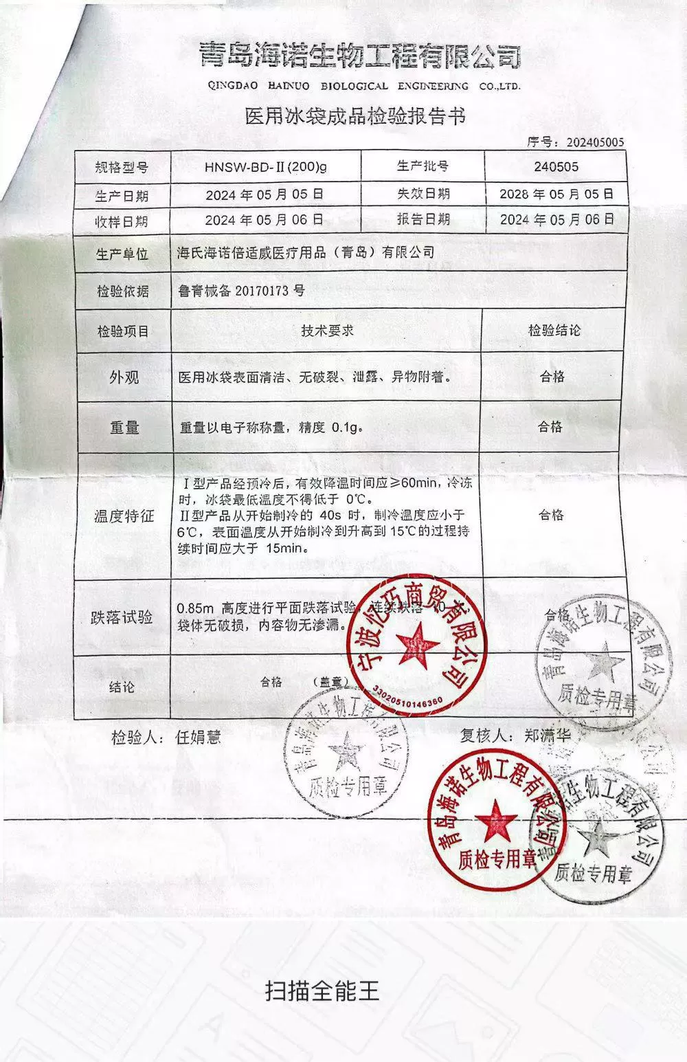海氏海诺医用冰袋200g【一盒6袋】 质检单