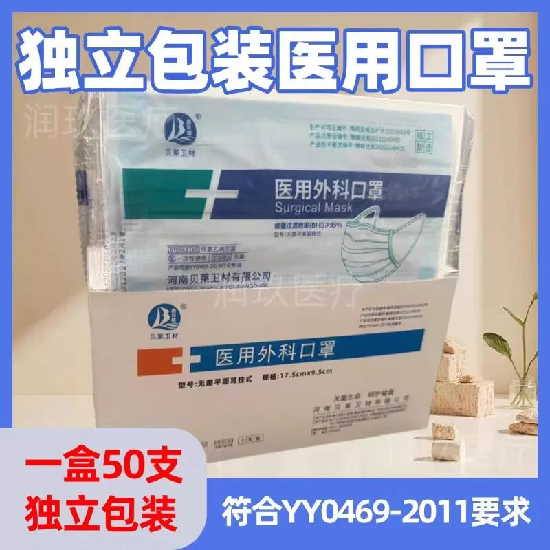 贝莱卫材医用外科口罩蓝色(成人单片独立装)50片/盒